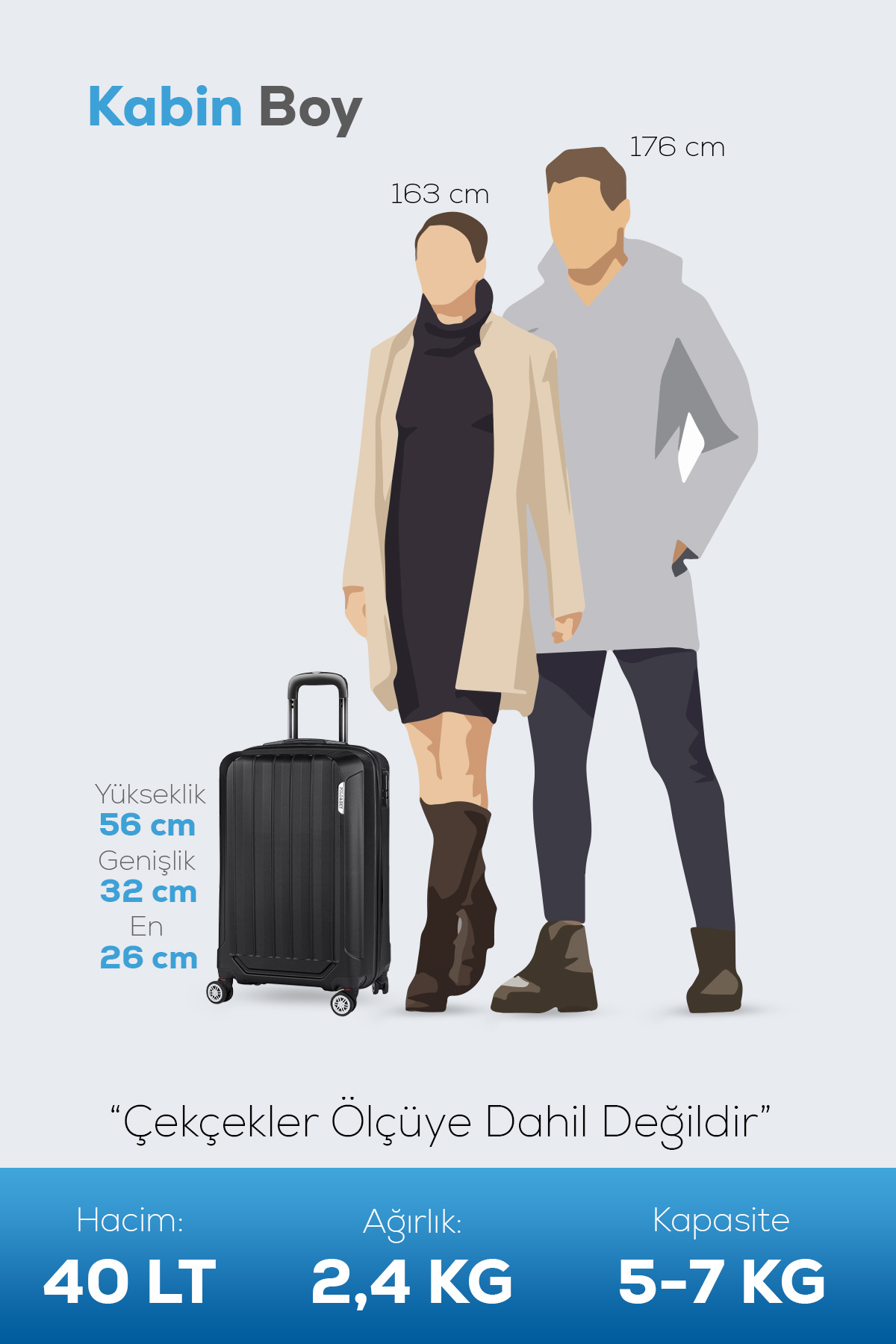 360 Derece dönebilen 8’li tekerlek sistemi Darbelere dayanıklı ABS materyal Kilitlenebilir Fermuar Yerli Üretim İç Ölçüler : En 26 cm, Genişlik 32 cm, Yükseklik 56 cm