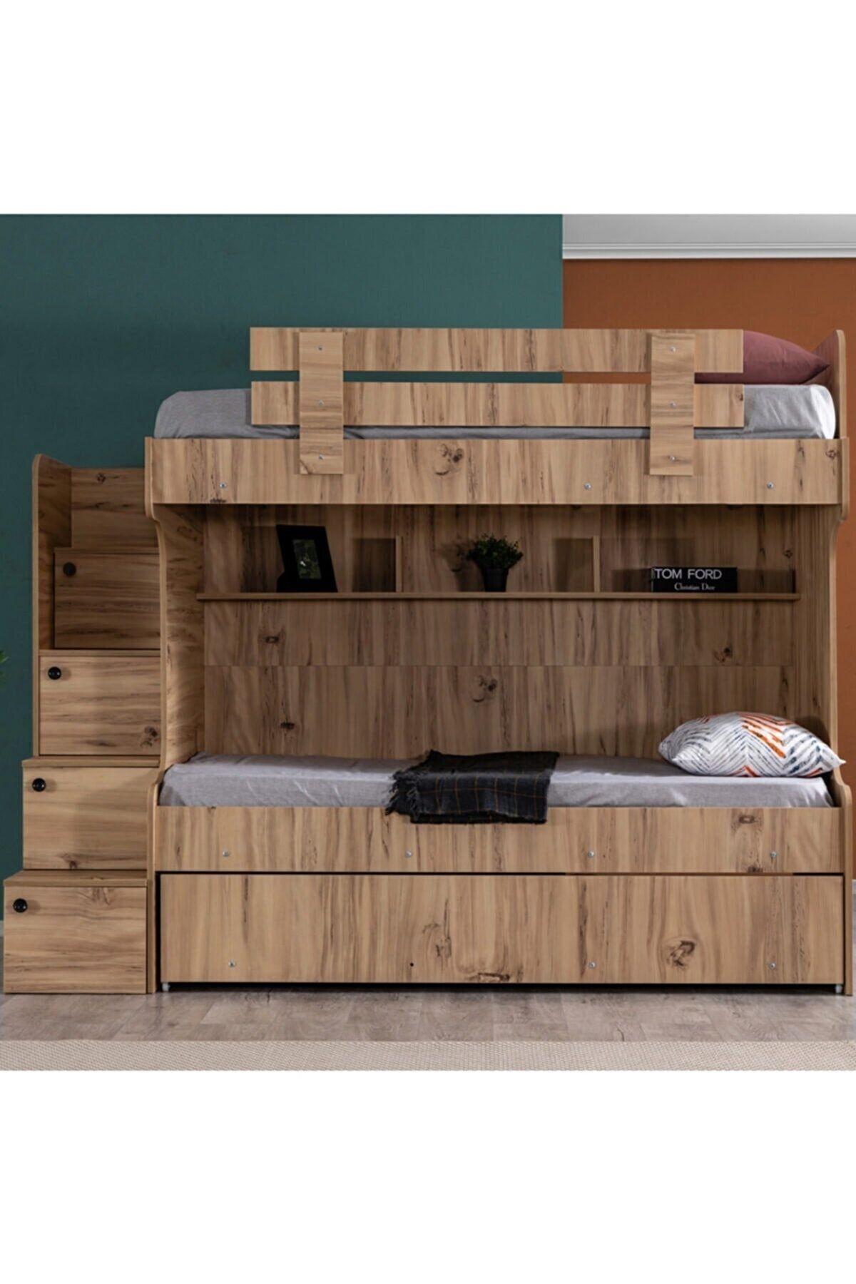 Üst Karyola, iç yatak ölçüsü: 90x190 cm / Alt Karyola, iç yatak ölçüsü: 90x190 cm Yavru Karyola, iç yatak ölçüsü : 90x190cm (maksimum 20 cm yükseklikte yatak tercih edilmelidir