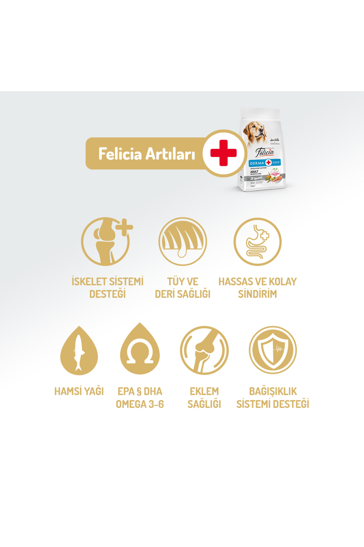 Felicia® olarak, orta ve büyük ırk yetişkin köpeklerin hassas ihtiyaçlarını ve gıdaya bağlı potansiyel hassasiyet risklerini hedefleyen yenilikçi çözümler sunuyoruz. Felicia® Derma Care Adult Salmon, kolajen desteği ve özenle seçilmiş süper besinlerle zenginleştirilmiş yeni nesil formülüyle, gıdaya bağlı hassasiyet riskini minimuma indirirken, dostunuza kapsamlı bir bakım sunar. Norveç somonundan gelen yüksek kaliteli protein, sadece üstün sindirilebilirlik sağlamakla kalmaz, aynı zamanda güçlü bir bağışıklık sistemi ile sağlıklı deri ve parlak tüy yapısının gelişimini aktif olarak destekler.