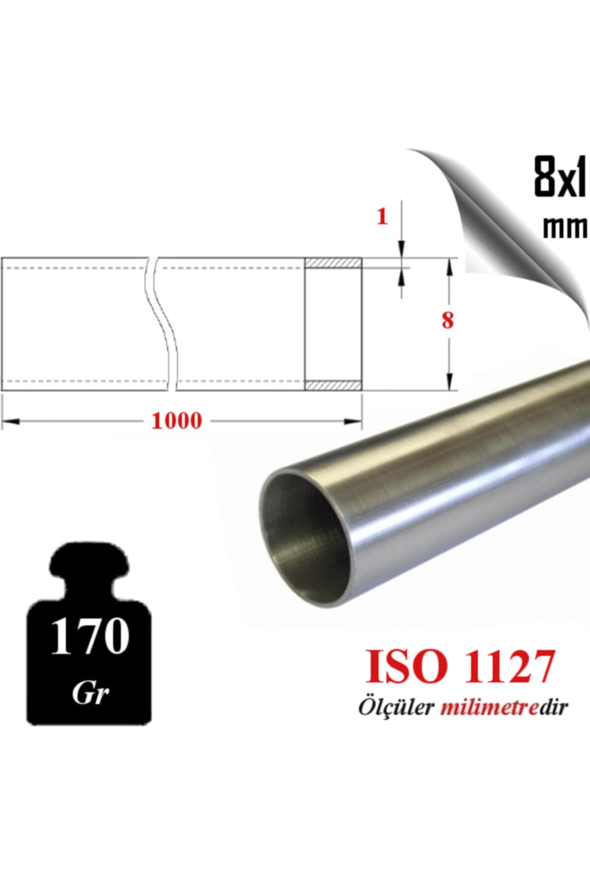 Paslanmaz Çelik 304 Kalite Boru 8 X 1 Mm (1 METRE)