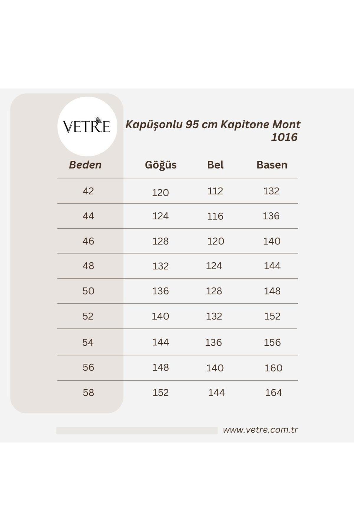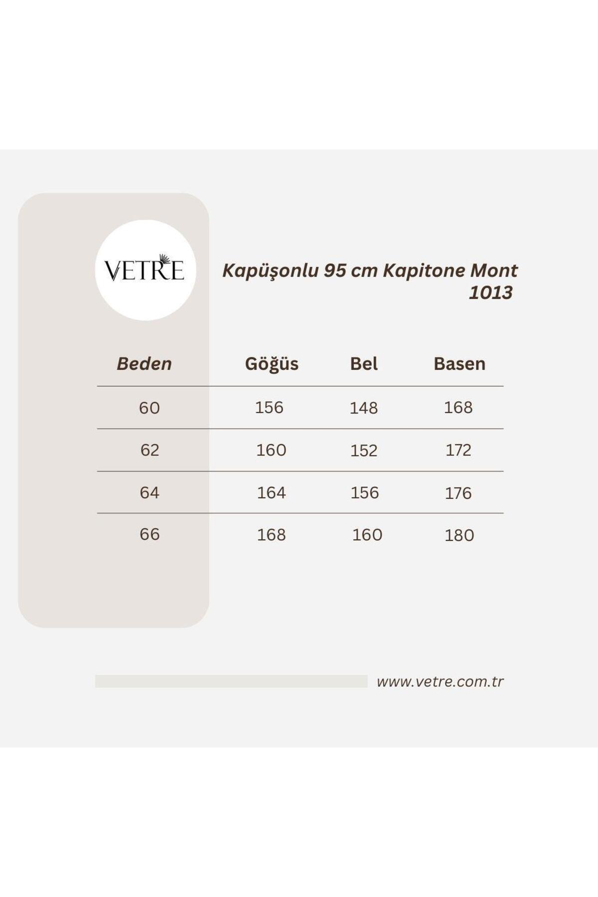 Kapüşonlu 95 cm kapitone montumuzun vizon, siyah, lacivert, haki ve bordo renkleri mevcuttur. 95 cm uzunluğunda olan ürünümüzün Cep ve çıtçıt detayı bulunmaktadır. Kapüşonlusu tercihe göre çıkarılabilmektedir. Montu ön kısmında bulunan fermuar ve çıtçıt ile kapatabilirsiniz. Ürünümüz klasik kesim olup, 42-66 beden aralığındadır, beden tablosundan yardım alarak kendiniz için en uygun bedeni tercih edebilirsiniz. Montumuzun