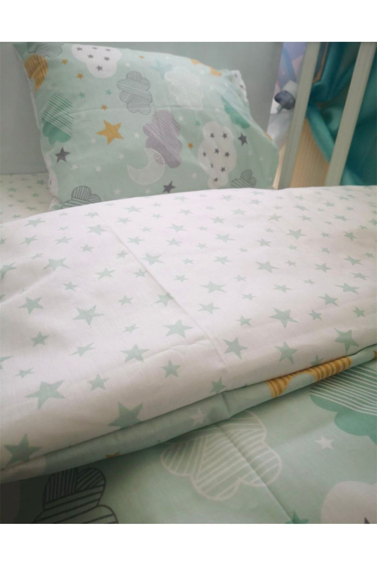 1 adet Çarşaf (110x190 cm), Yeşil Yıldızlı desenlidir..