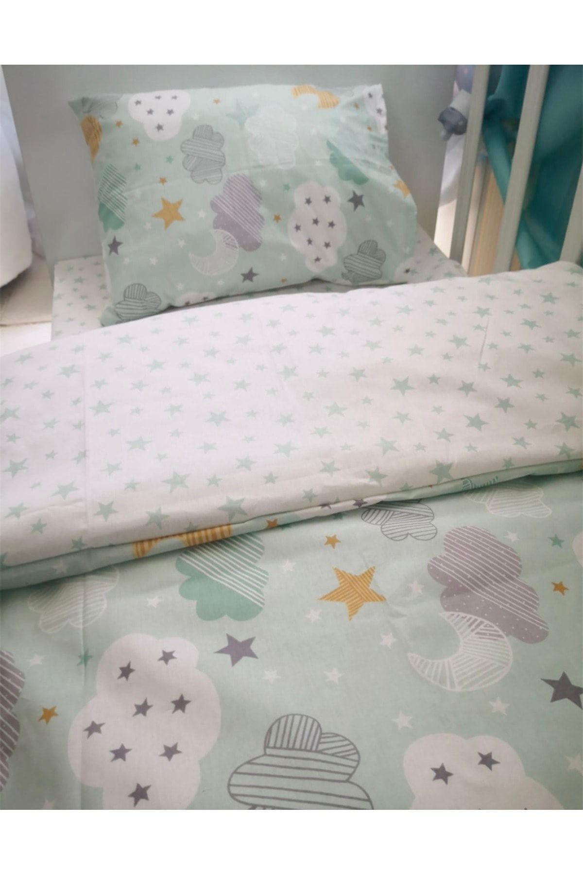 1 adet kılıflı yorgan (içi elyaf dolgulu ve kılıfı çıkartılabilir) (90x160 cm), Yeşil Ay Yıldız/Yeşil Yıldızlı Desen olarak çift desenlidir.