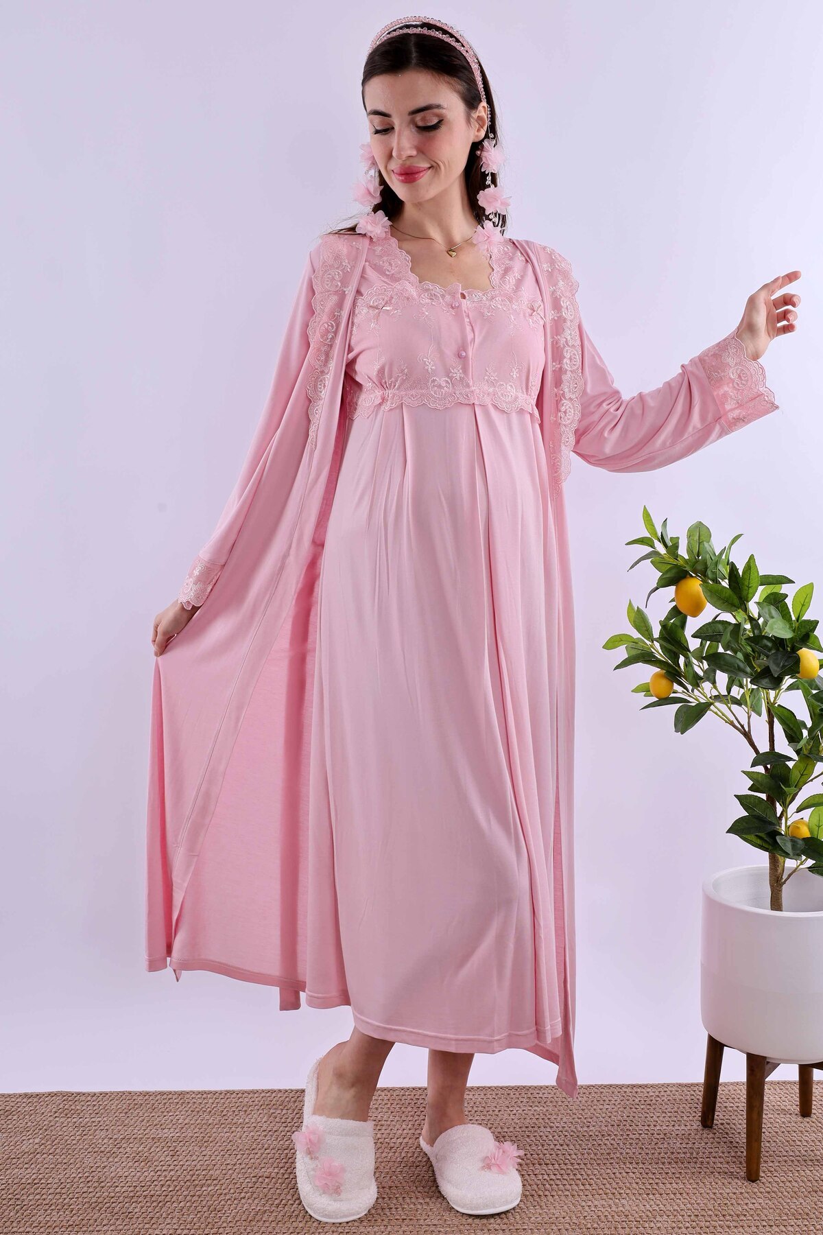 Set pijama takımı, sabahlık ve gecelikten oluşmaktadır,