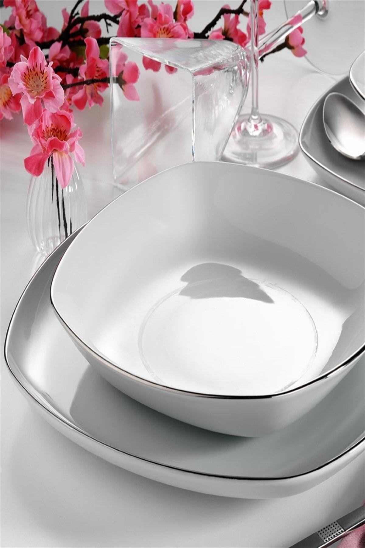 - Kare şekliyle klasik ve zamansız bir görünüm sunan bu set, her türlü sofra düzenine uyum sağlıyor