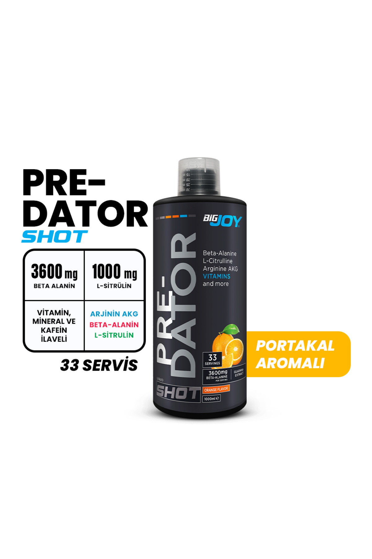 Big Joy Pre-Dator Shot 1000 mL'in Dikkat Çeken Özellikleri: - Servis başına 3600 mg beta alanin, 1000 mg arjinin AKG, 1000 mg sitrülin, 800 mg taurin, 210 mg kafein - Antrenman öncesinde kullanımı sayesinde, antrenmanda pump etkisi - Beta alanin, sitrülin, arjinin akg vb.