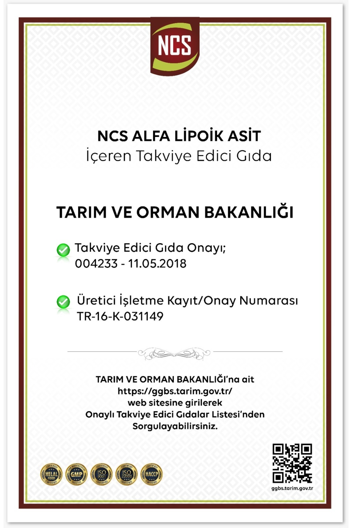 Tarım ve Gıda Bakanlığı İyi Üretim Uygulaması (Gmp) Gıda Takviyeleri Üretim Belgesi (FQC) Gıda Üretimi İçin Sicil Belgesi Gıda Takviyesi Paketleme Belgesi (TGS) Marka Patent Belgesi (Tpe) 05 Sınıf NCS Ürünlerimizin Üretim Tarihleri Yenidir.