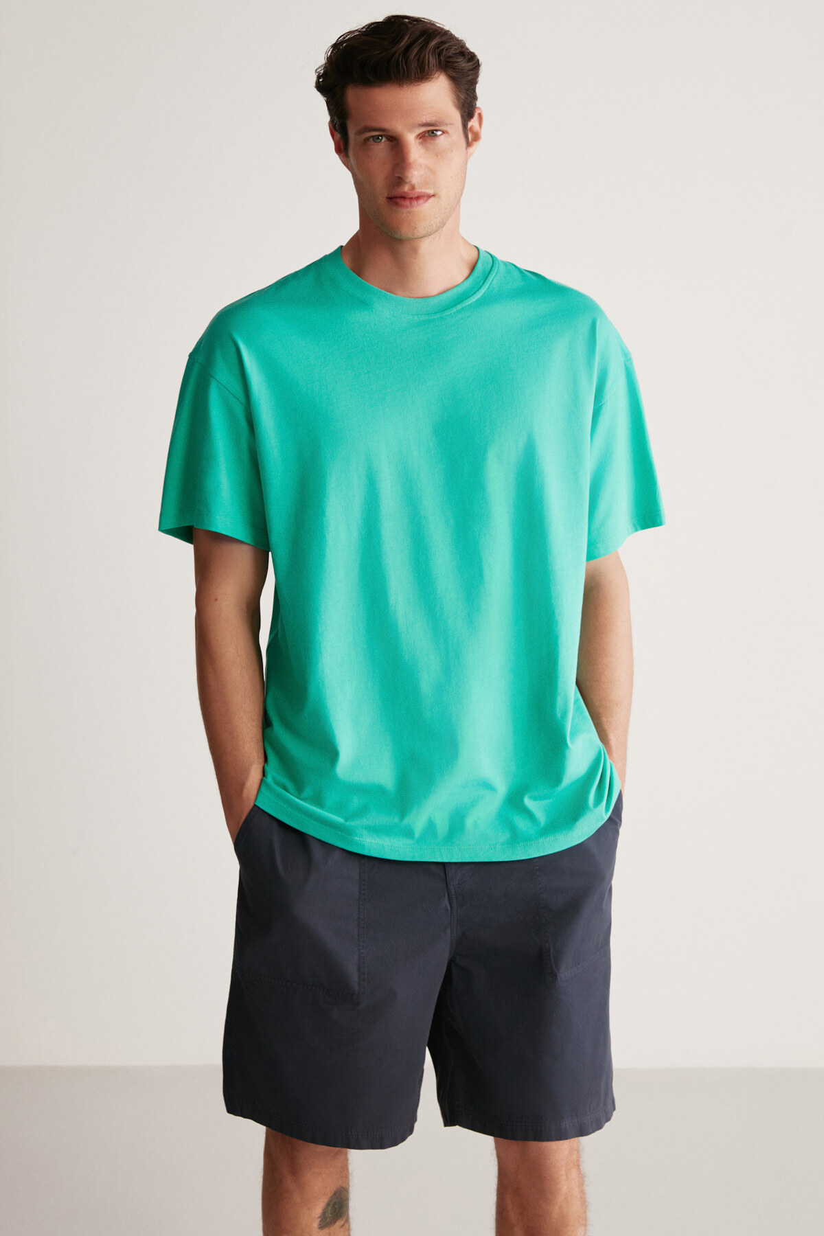 Jett Erkek Oversize Fit %100 Organik Pamuk Kalın Dokulu Bisiklet Yakalı Taş Rengi T-shirt