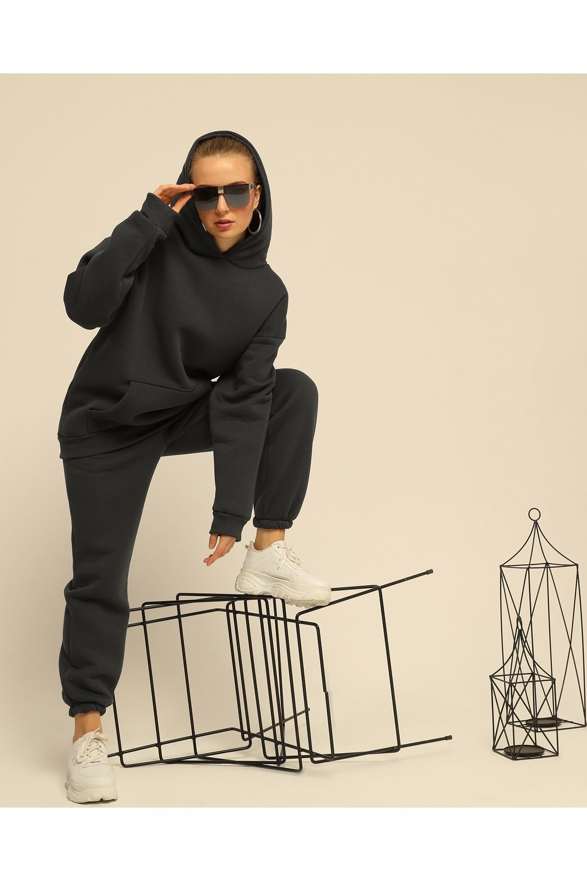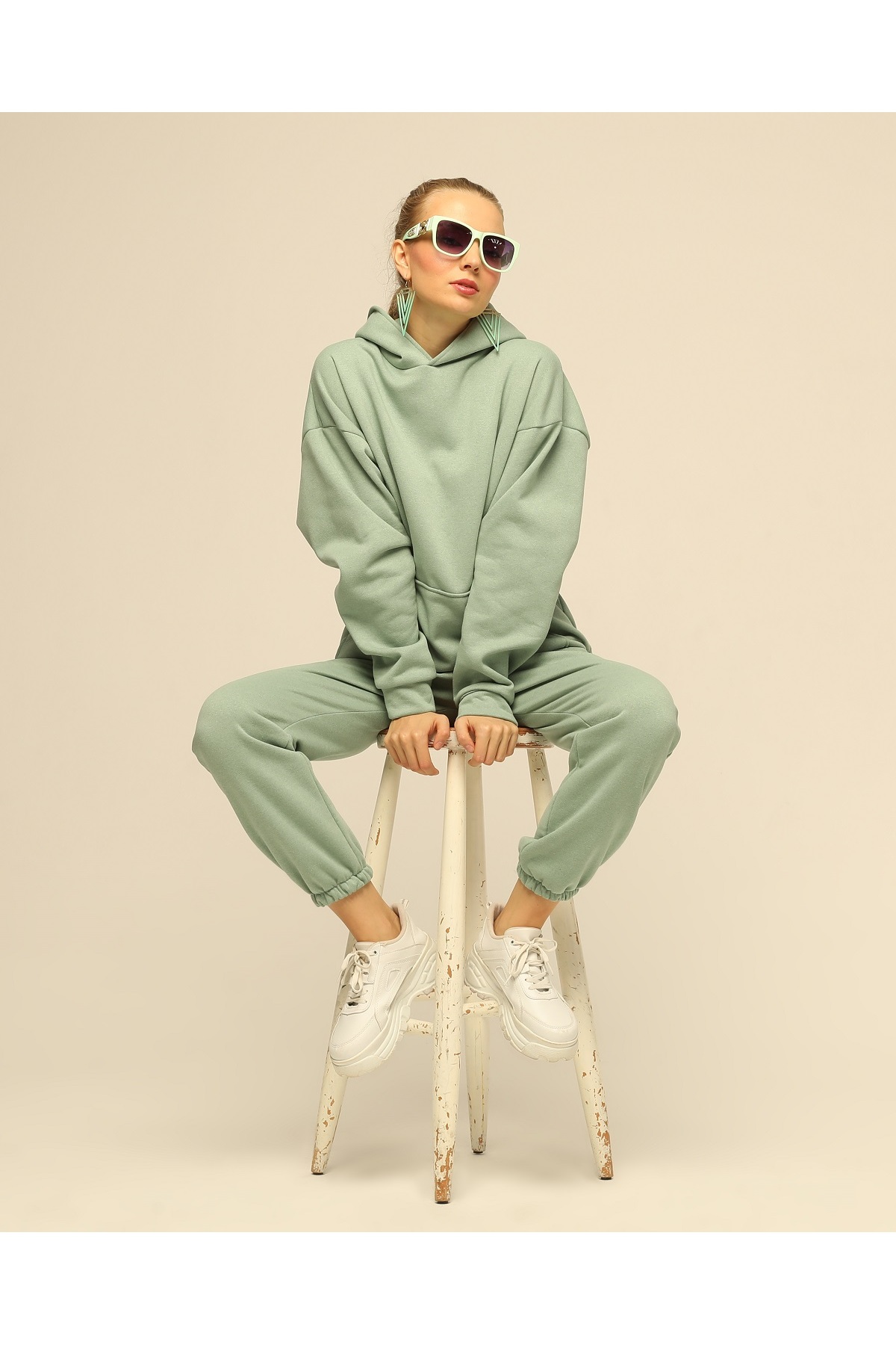 Uzun kollu sweatshirt ve lastikli paça pantolon kombinasyonu ile rahat hareket etme olanağı tanır.