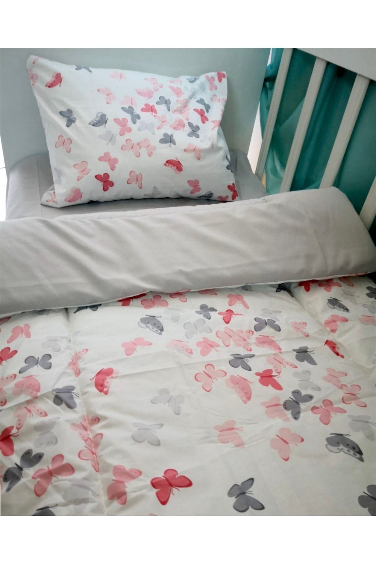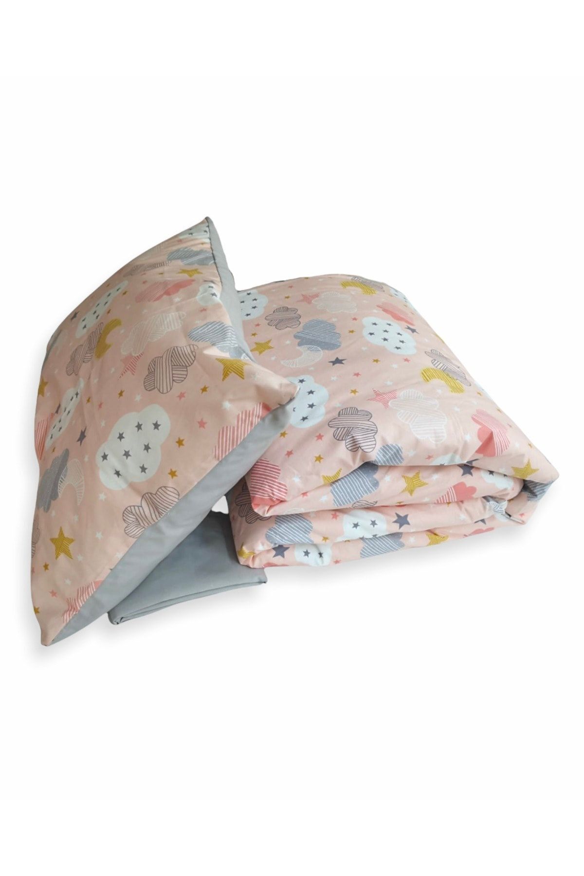 1 adet kılıflı yorgan (içi elyaf dolgulu ve kılıfı çıkartılabilir) (80x110 cm), Kahverengi Gökkuşağı / Kırık Beyaz (Krem) Desen olarak çift desenlidir.