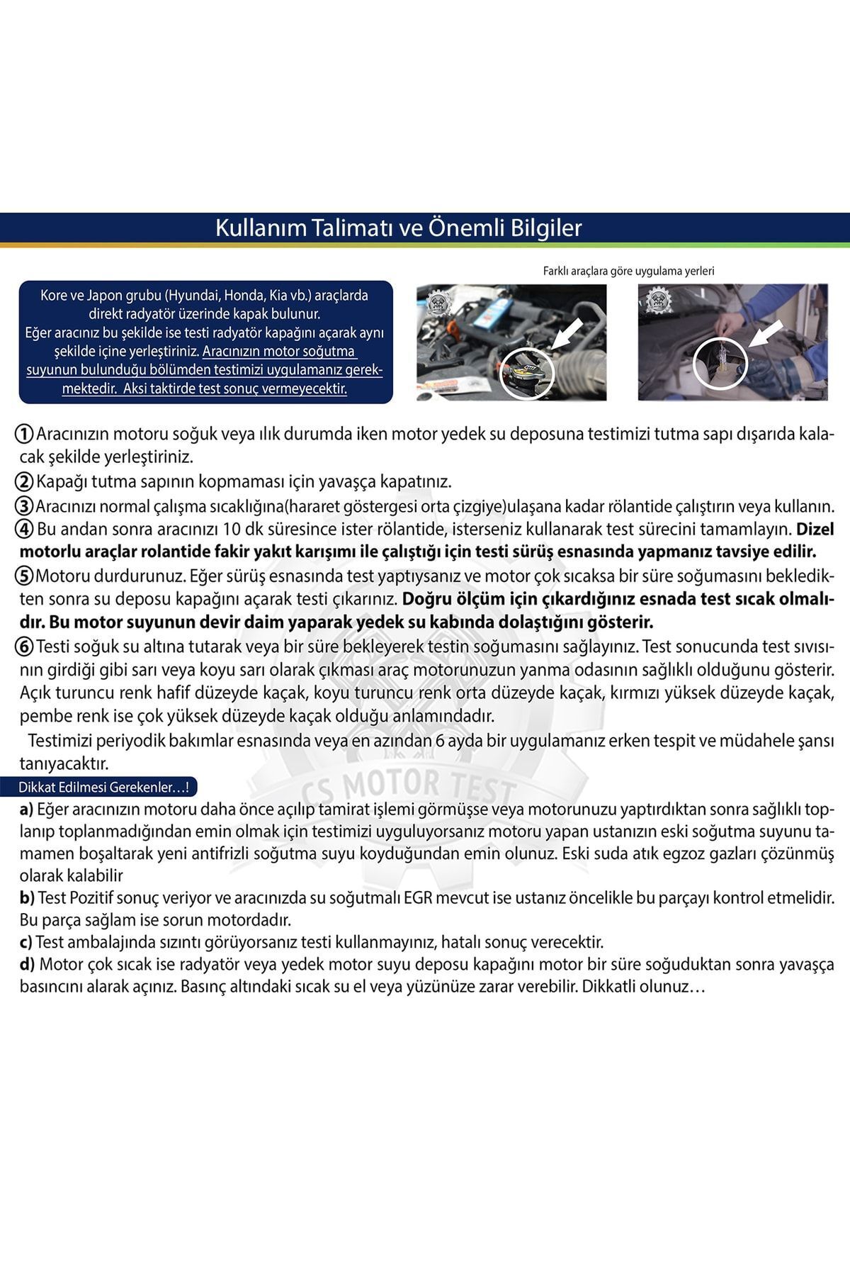 İkinci El Araç Almadan Önce Kesin Yapılması Gereken Test KİTİ CS MOTOR TEST Araç Motorlarında Yanma Odası Kaçaklarının (Silindir Kapak Contası Kaçağı ve yanığı, Kapak ve Blok Çatlağı) tespitini sağlar.Herkesin Kullanıp sonuç alabileceği şekilde geliştirilmiştir.