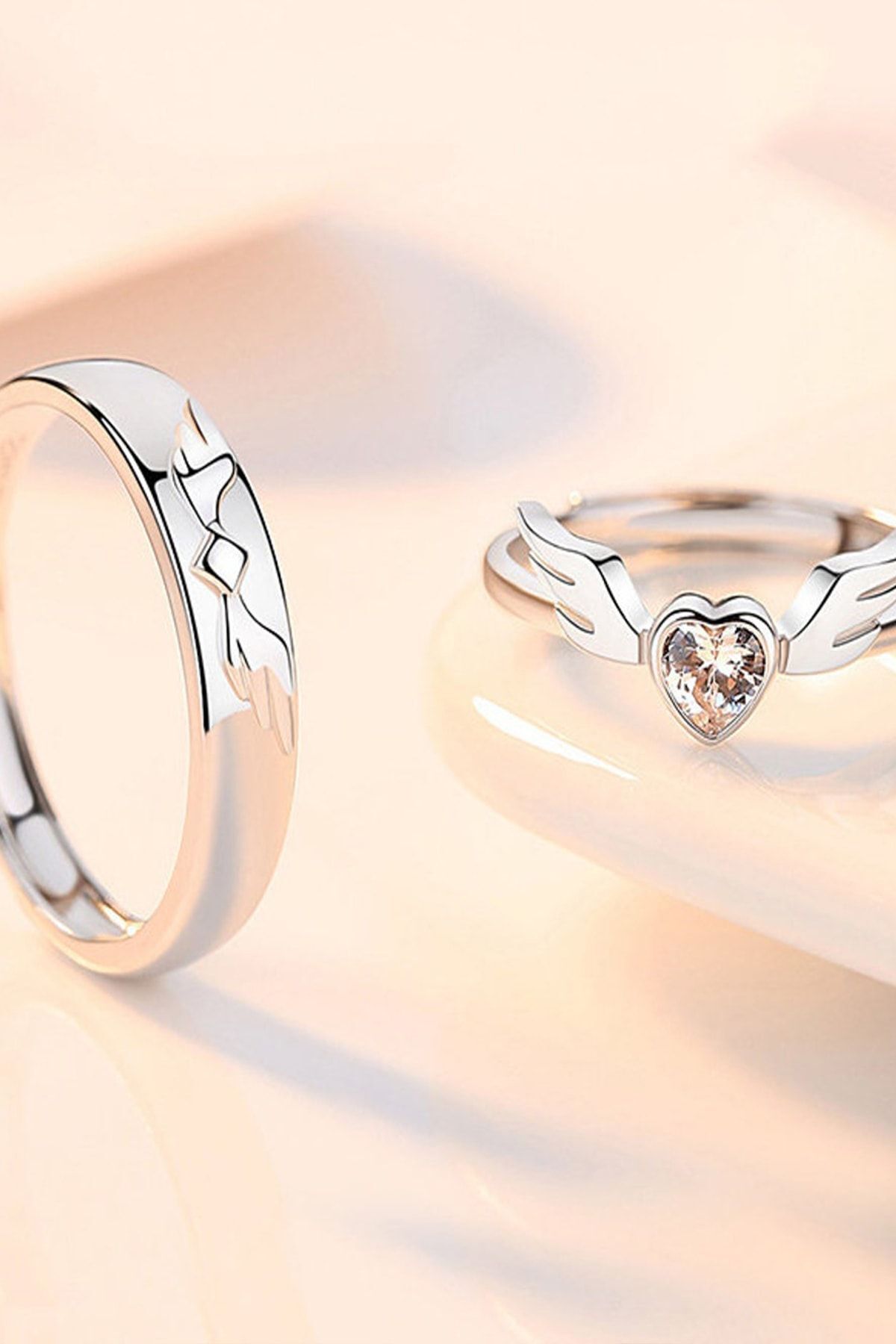 - Zarif melek motifleriyle süslenmiş, göz alıcı bir tasarıma sahip bu gümüş kaplama çift alyans yüzük, özel günlerinizde şıklığınızı tamamlar