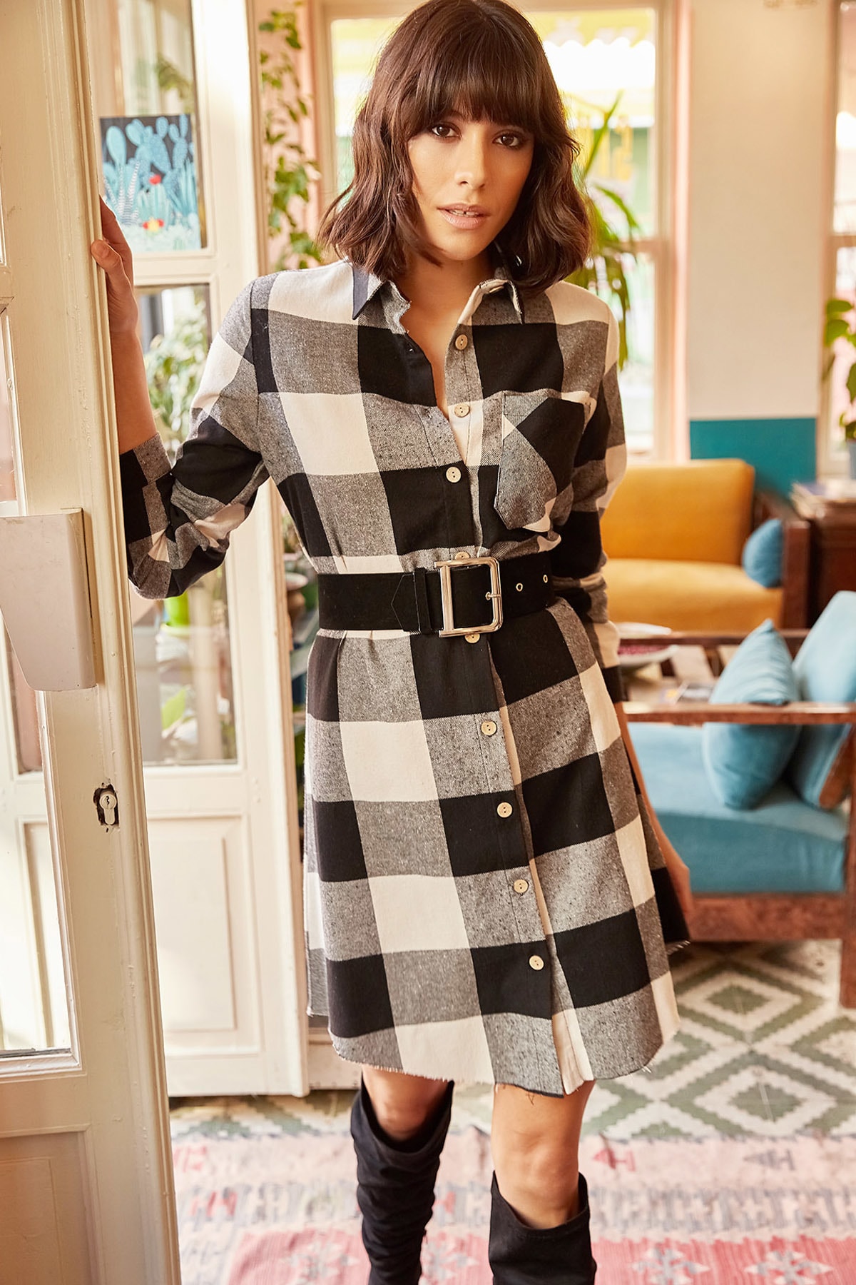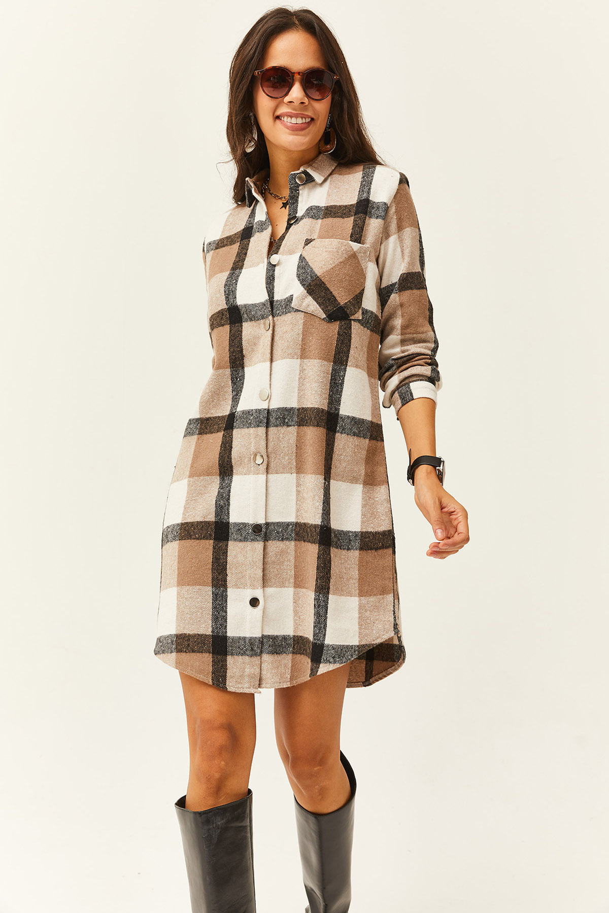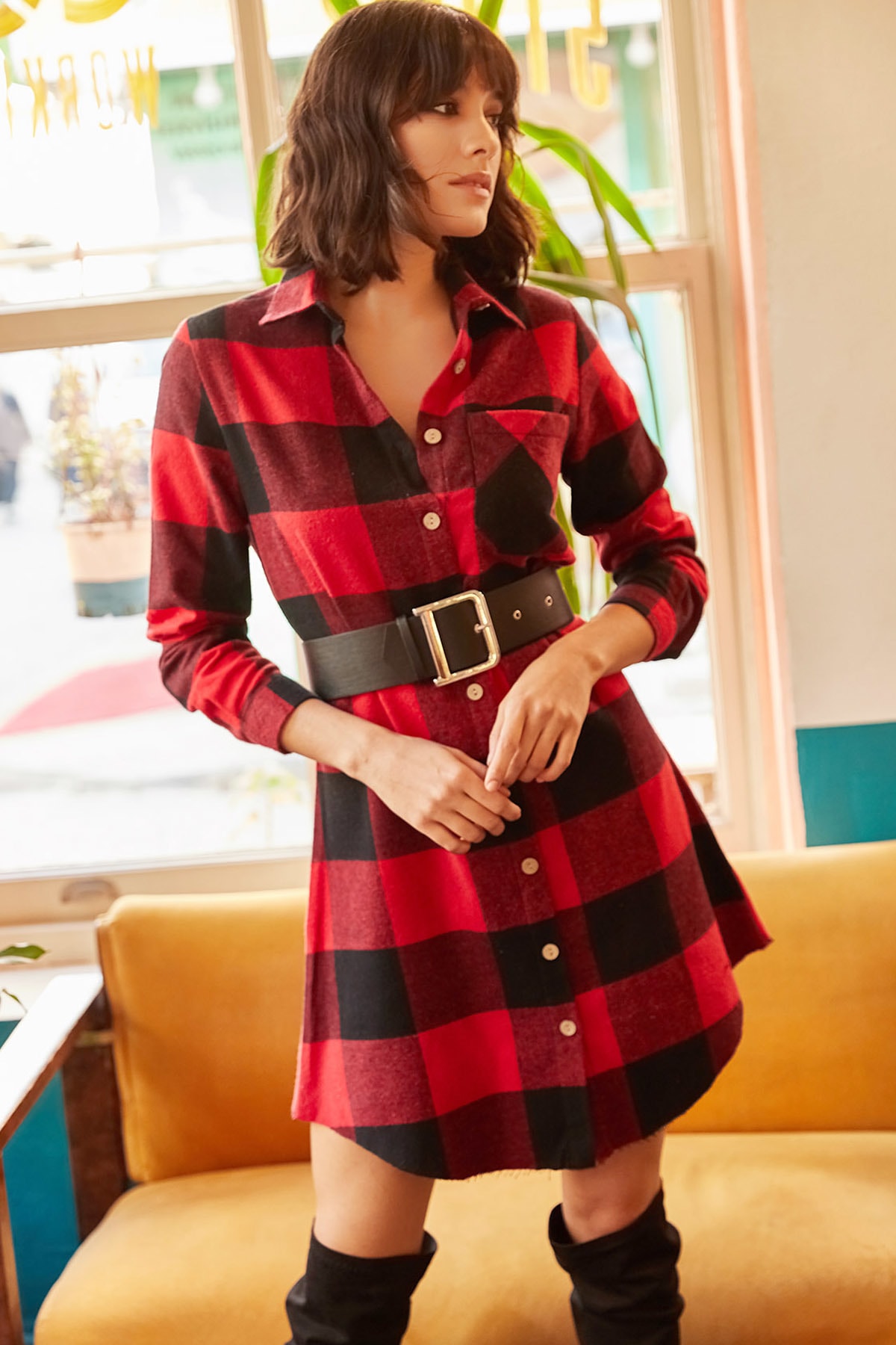 Kadın Bordo Ekru Oduncu Kalın Ekose Tunik Elbise ELB-19000836