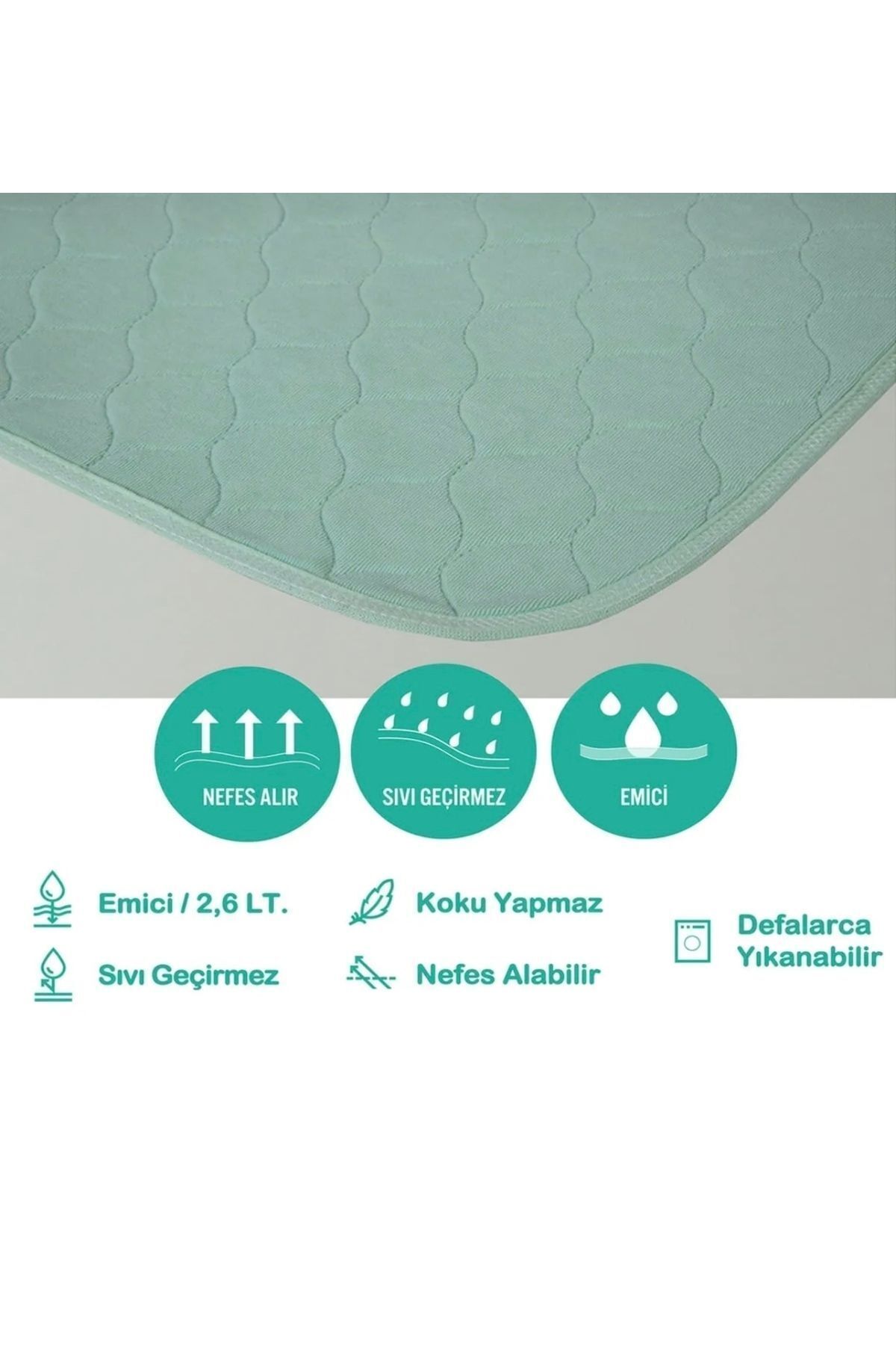 ürünün mutlaka ilk önce yıkanması gerekiyor. (üstündeki sıvı geçirmezlik apresinin iş görebilmesi için.) ürünün tamamen birbirine lamine edilmiş olması kumaşta kat oluşumunu engeller. Sıvı alt katmanlara çok hızlı bir şekilde iletilerek, üst katmanın kuru kalmasını sağlar, üzerinde yatan kişi ıslaklık hissetmez. Hiçbir sıvıyı geçirmez, leke tutmaz, kötü koku oluşumunu engeller, sıvı emme kapasitesi 3 lt/m² dir. Insan ve hayvan sağlığına zarar verecek maddelerden arındırılmış sağlıklı tekstil ürünlerine dönük ihtiyacı karşılamak amacıyla geliştirilen ve tekstil sektöründe otorite kabul edilen oeko-Tex 100 standard class 1 sertifikası'na sahiptir. NOT: YEŞİL, BEYAZ, MAVİ VE PUDRA RENK STOK BAZLI SEVK EDİLMEKTEDİR. BU ÜRÜNÜN ÖZELLİK VE KULLANIM BAKIMINDAN DEĞERLENDİRİLDİĞİNDEN DESEN VE RENK SEÇENEĞİMİZ MEVCUT DEĞİLDİR.