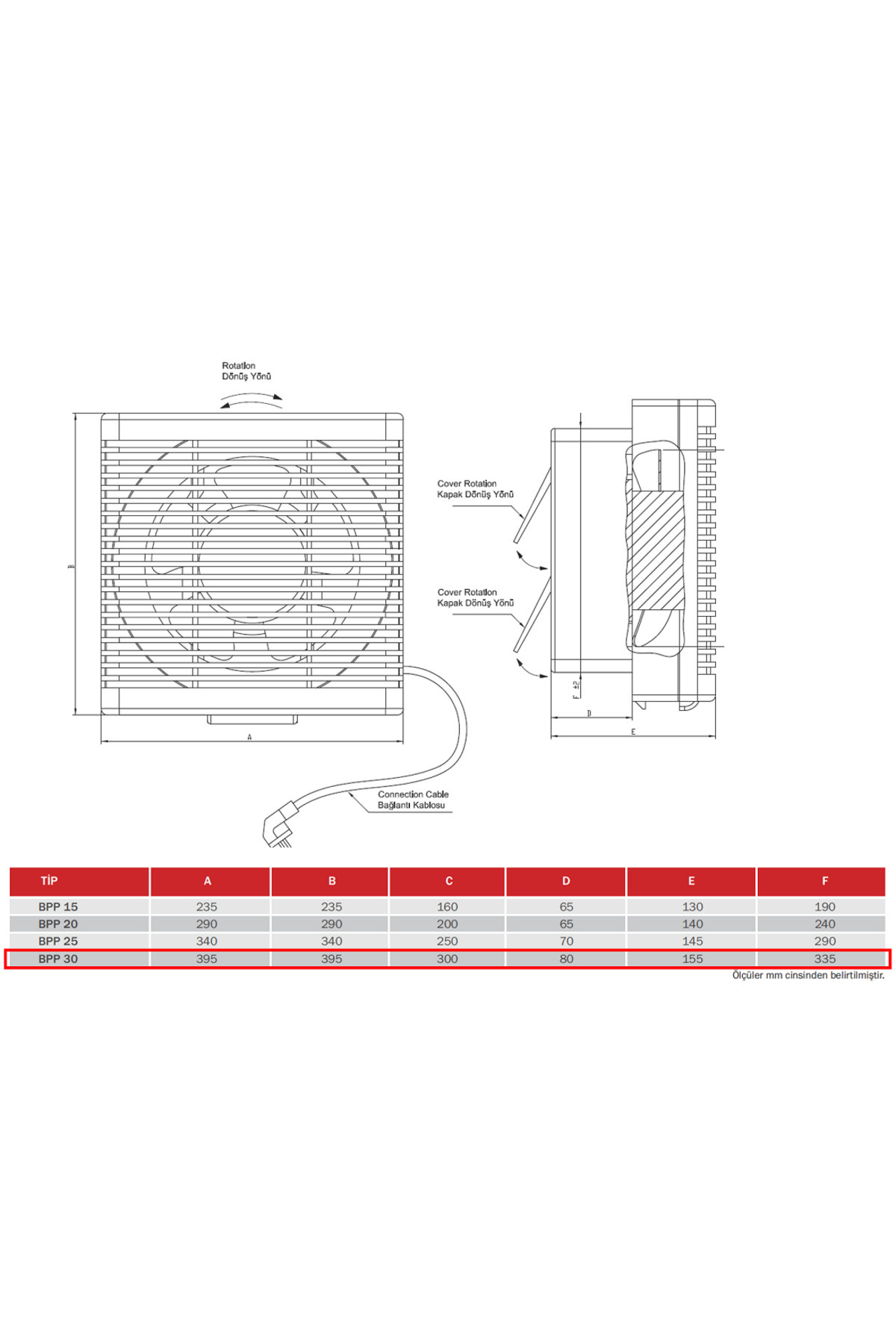 Bvn bpp 30 çift yönlü plastik aspiratör (1100m³/h) Bvn bahçıvan bpp serisi çift yönlü fanın çalışma şekli monofaze’dir. (220v) Duvar ve pencere tipi olan ürün, çift yönlü çalışma özelliğine sahiptir. Ürün yüksek kalite abs plastikten üretilmiştir. Sessiz bir fandır. Aksiyel kanat yapısına sahip ürün, etkili bir havalandırma sistem ürünüdür. Arka panel üzerinde bulunan panjurlar ürün kapalı iken hava akışını önler. Havalandırma fanları içerisinde en sessiz fan kategorisinde yer almaktadır. Korozyona karşı dayanıklı yapıya sahip olup, uzun ömürlüdür. Fan özel tasarımlı dekoratif ön yüzeye sahiptir. Havalandırma fanı kullanım alanları başlıca