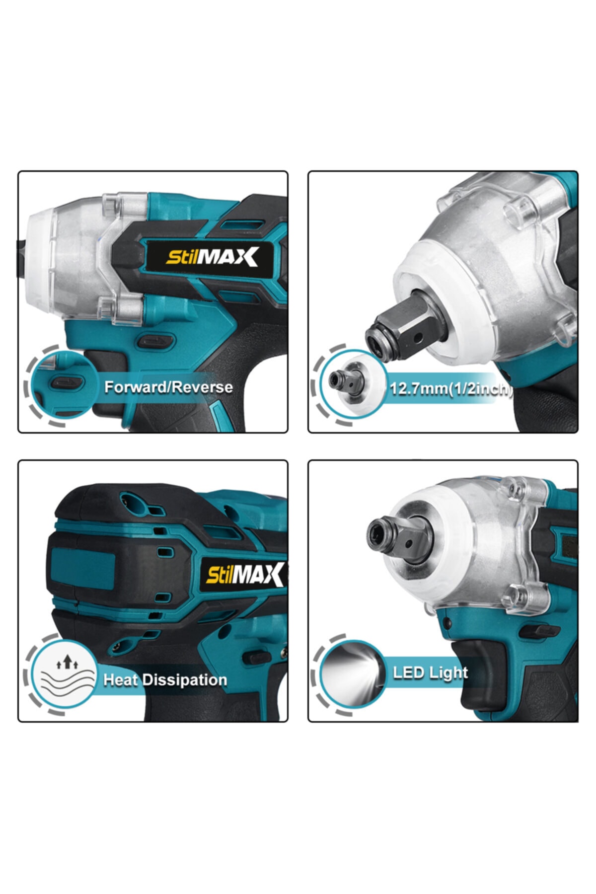 Özellikler Renk: siyah + mavi Yük hızı yok: 0 - 4000 rpm Darbe frekansı: 0 - 4000 ipm Maksimum tork: 550N.M Kare sürücü: 1/2" Özellikler -550N.M yüksek tork, kademesiz hız değişimi anahtarı.