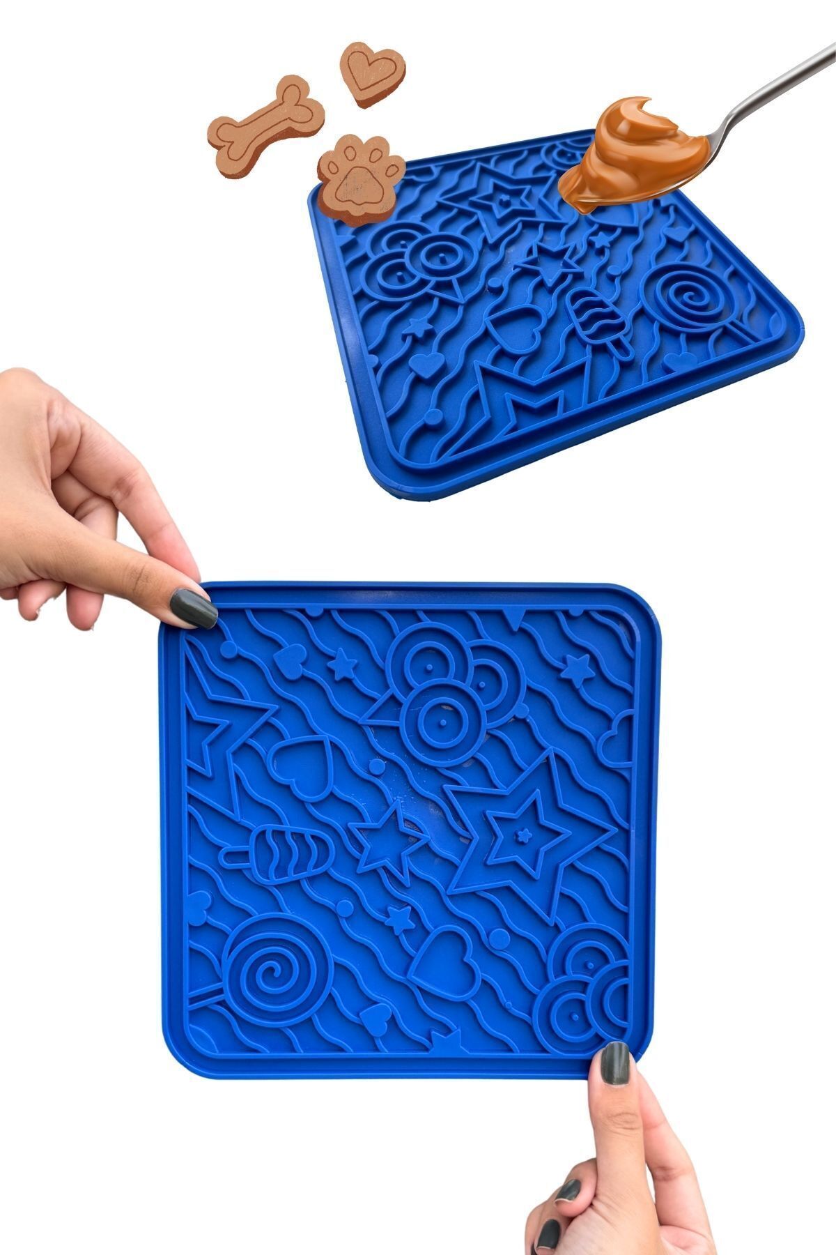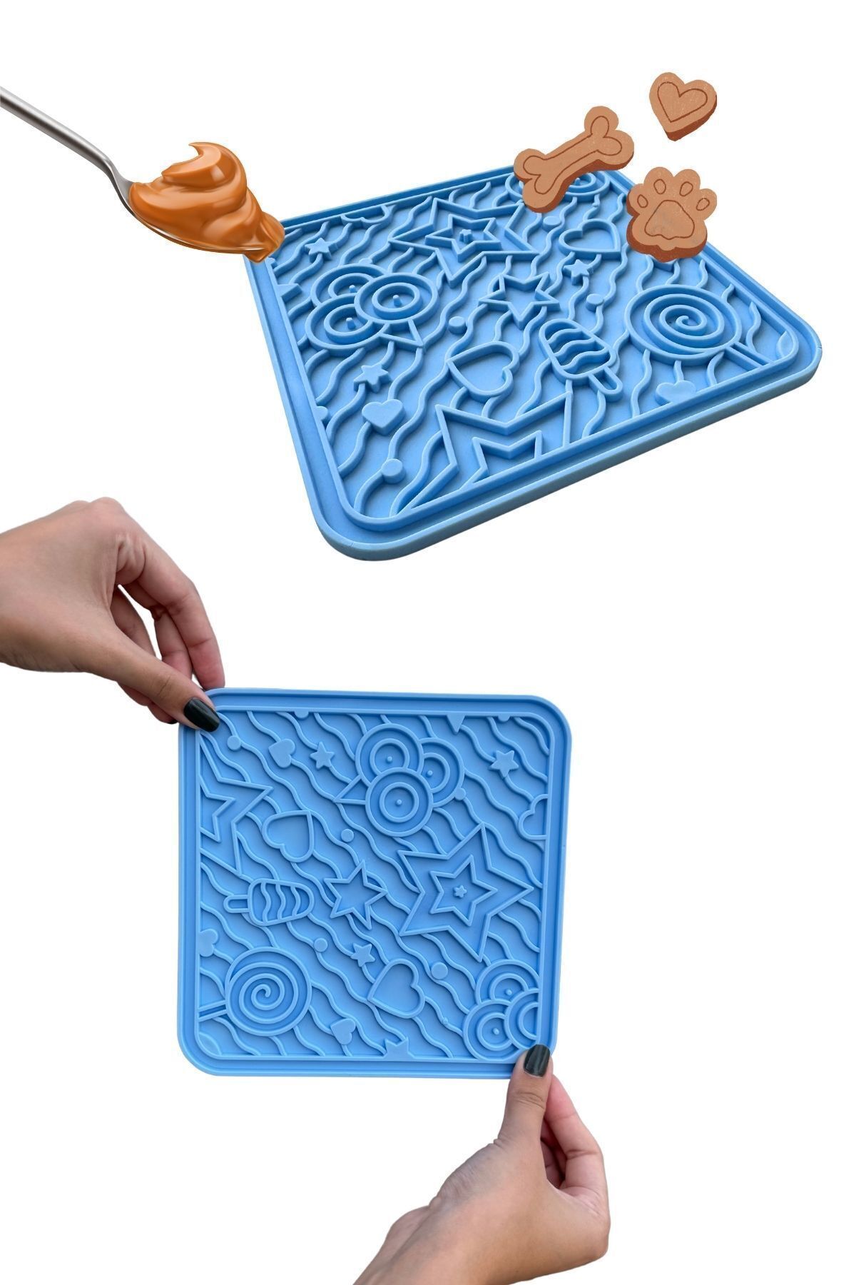 yiyecek artıkları ve bakterilerin azalmasıyla kötü nefes kokusununun önüne geçer. Nasıl Kullanılır? Yüzey Seçimi:Yalama Matını kullanmak istediğiniz düz ve temiz bir yüzeye yerleştirin. Cam, fayans, düz zemin gibi pürüzsüz yüzeyler en uygun olanlardır. Yiyecek Hazırlığı:Kedi ya da köpeğinizin sevdiği bir yiyeceği (örneğin, fıstık ezmesi, yoğurt, meyve püresi) matın üzerindeki dokulu alanlara yayın. -Opsiyonel- Dondurma:Yiyeceği mat üzerine yaydıktan sonra, matı dondurucuya koyarak dondurabilirsiniz. Daha uzun süre meşgul olmasını sağlayabilir.
