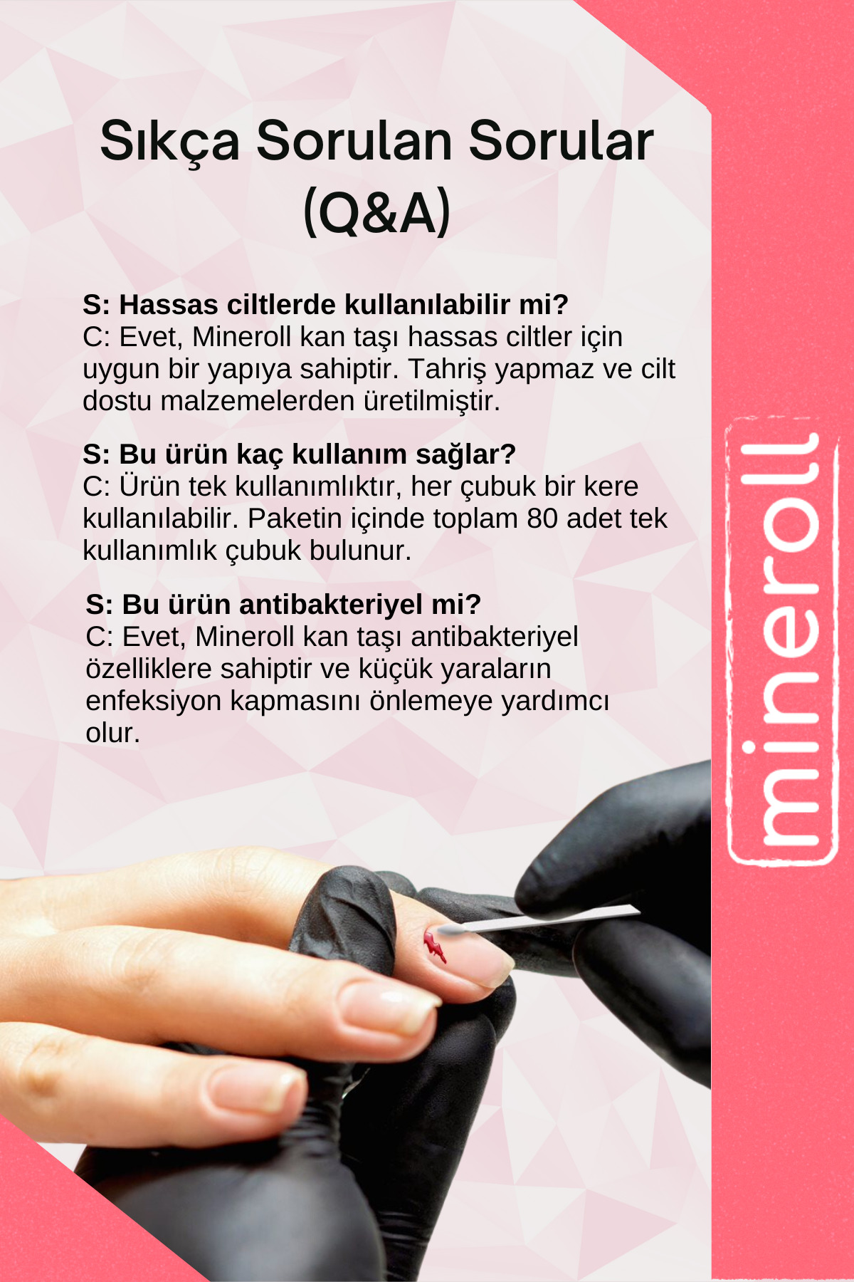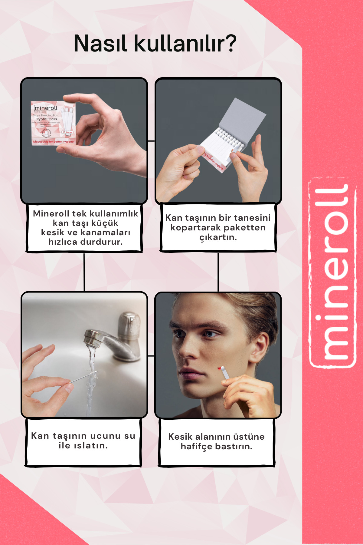 Kullanımı: Mineroll çubuk kan taşının bir tanesini kopararak ucunu su ile ıslatın. Kesik alanının üstüne hafifçe bastırın. Tek kullanımlıktır, kullandıktan sonra atın.