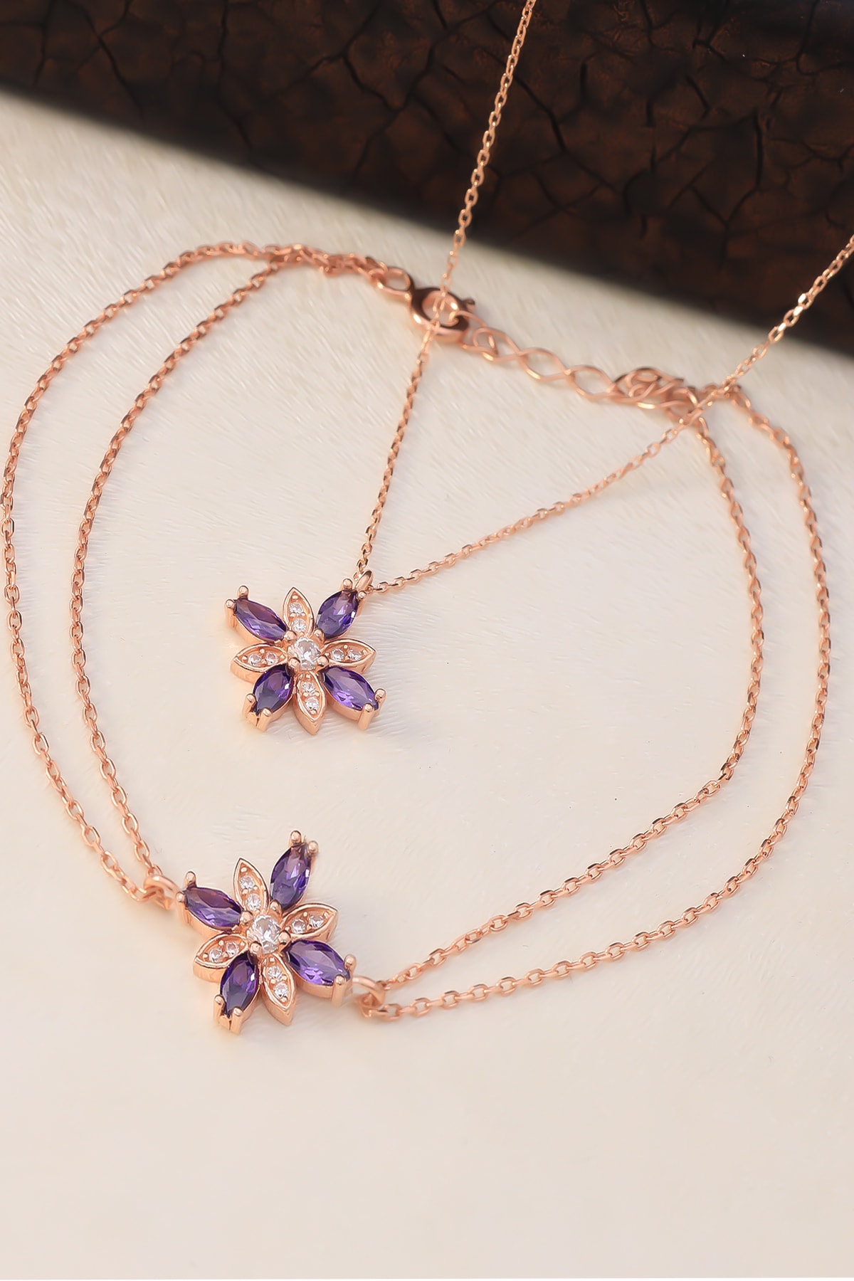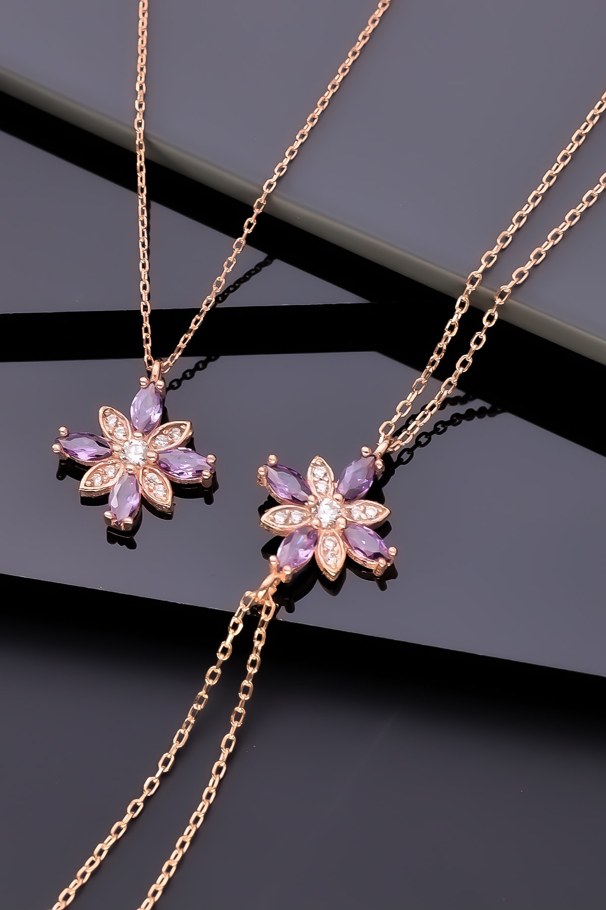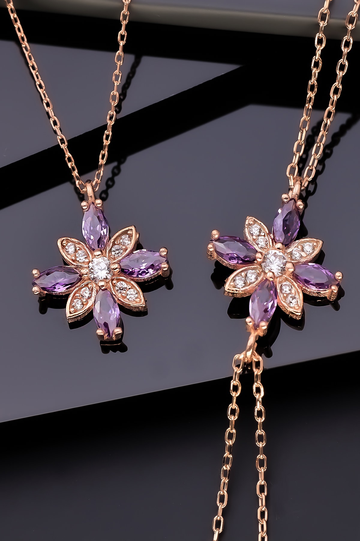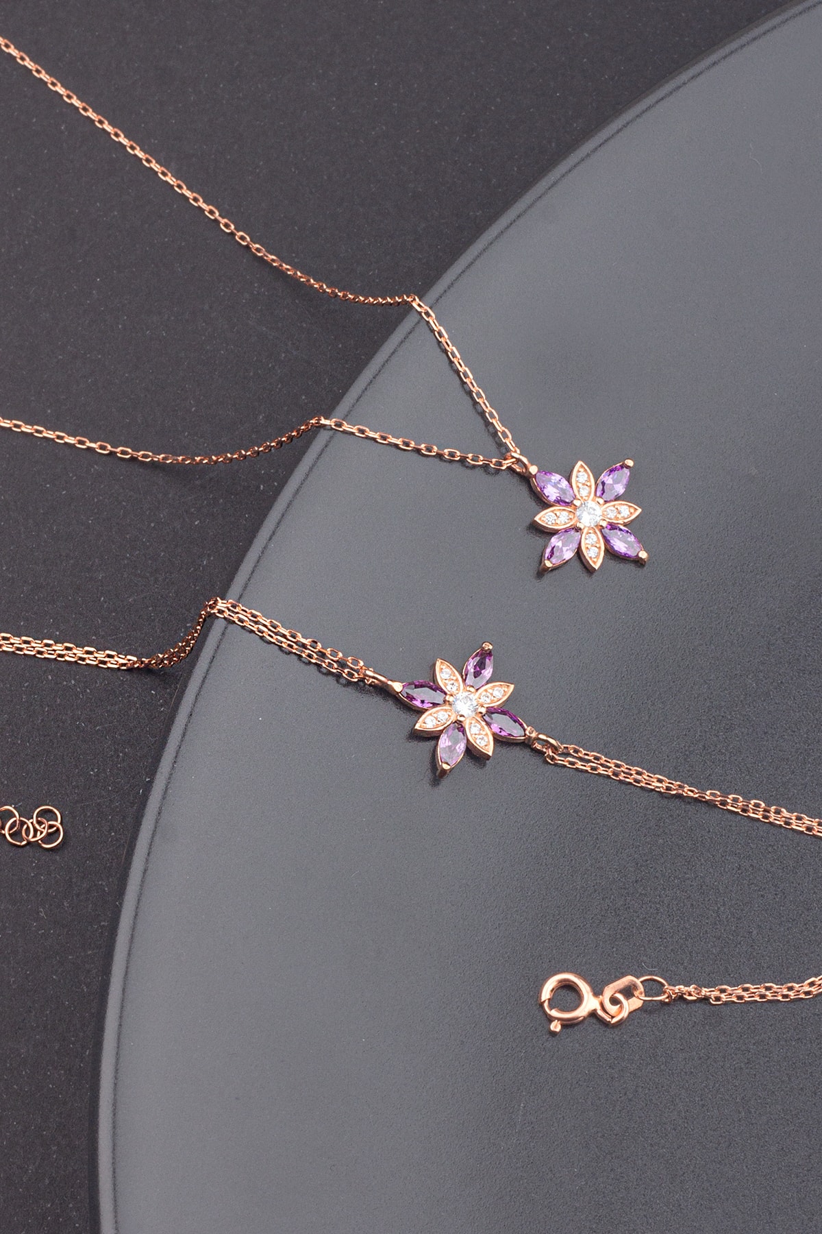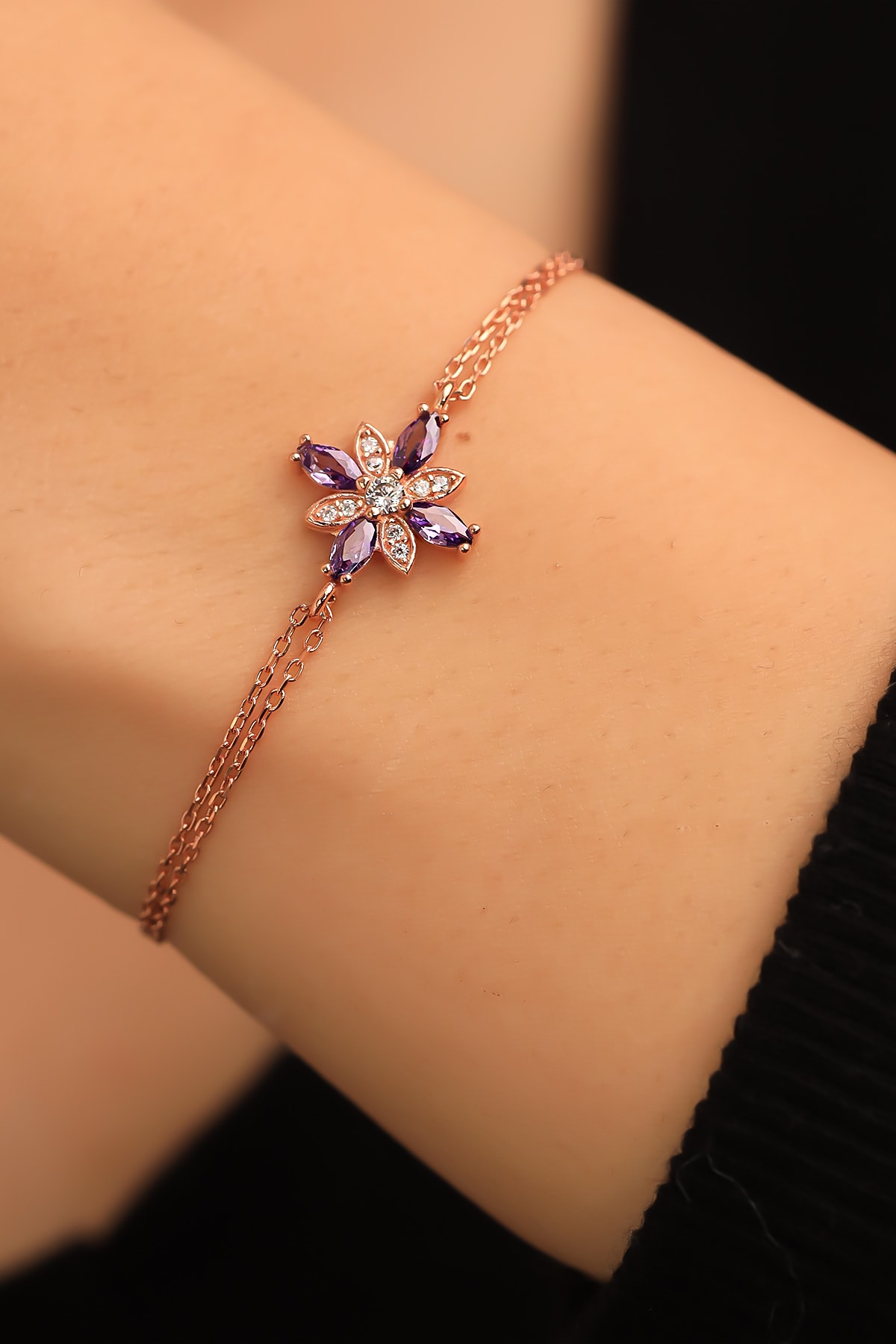 Ametist taş detaylarıyla süslenmiş, göz alıcı bir görünüm kazandırır ve zarif bir stil oluşturur