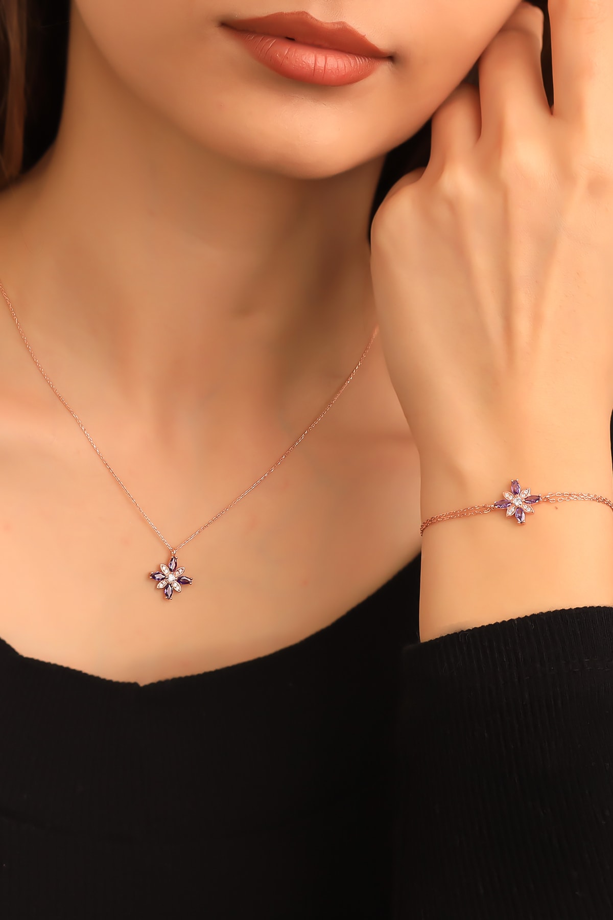 Hem kolye hem de bileklik olarak tasarlanmış set, uyumlu ve şık kombinler için idealdir