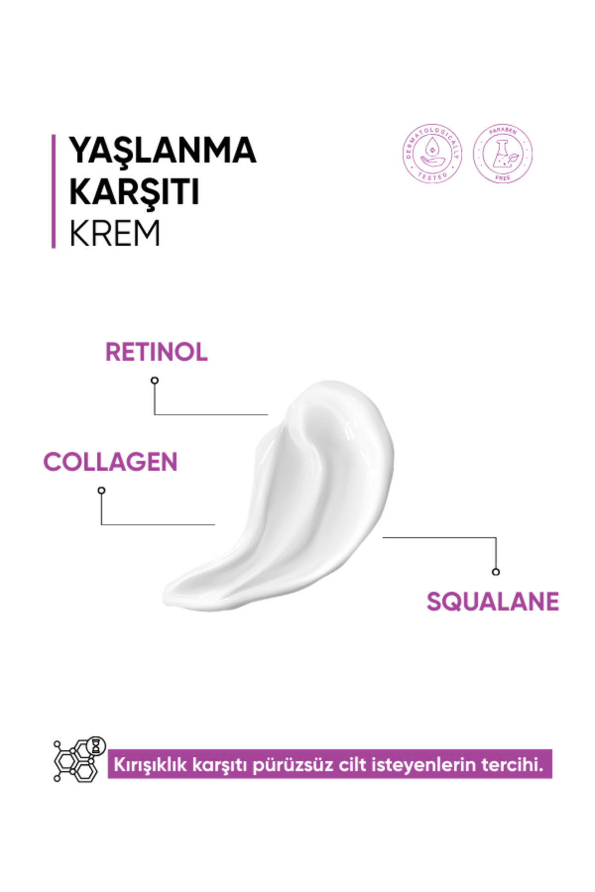 Retinol Ve Kolajen Yaşlanma Karşıtı Krem Cildi nemlendirir, pürüzsüzlük kazandırır.