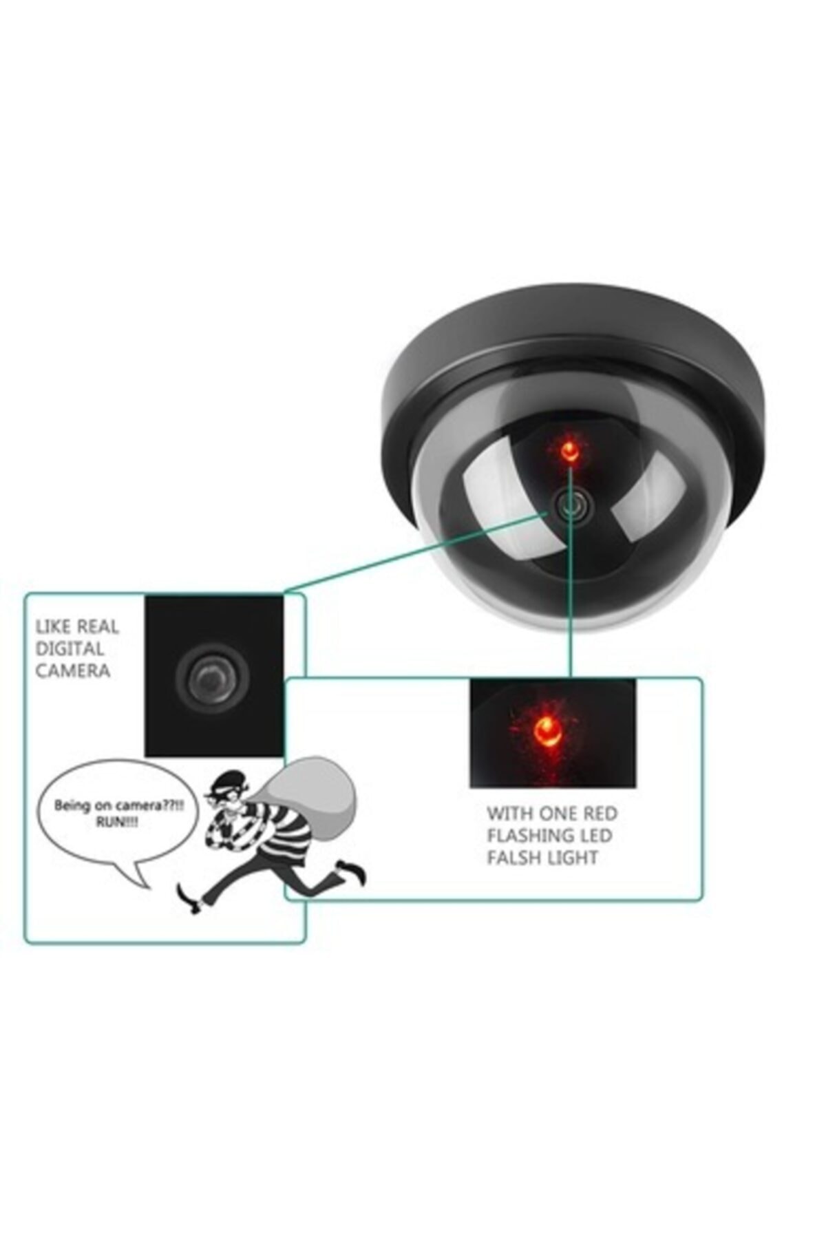 Sahte dome kamera gerçekçi görünüm kayıt yapıyormuş izlenimi verir Bitenekadarcılar daha güvende olabilsinler diye, Sahte dome kamera. Kayıt yapıyormuş gibi izlenim bırakır. Elektrik tesisatına ihtiyacı yoktur 2 adet +aa pille çalışır. Gerçekçi görünümü sebebiyle caydırıcılık özelliği oldukça yüksektir. Apartman girişlerinde, işyerlerinde, garaj kapısında, müstakil evinizin girişine, yazlık evlerinizde veya koridorlarda istediğiniz her yerde kullanabilirsiniz. Genelde güvenlik kamera sistemleri yapılan suçun kaydedilmesi yerine ilk etapta suçluyu caydırıcı bir etki yapması amacı kullanılmaktadır. Sizin için de iş işten geçtikten sonra kaydedilmiş yada kaydedilmemiş pek önemli değil ise bu ürün işinizin büyük bir kısmını çözecektir. Yada gerçek kamera kullanıyor iseniz suçlunun gerçek kameranın nerde olduğunu fark etmeyecek şekilde yerleştirin. Diğer kameraları görünür yerlere koyup suçlu taklit kameralardan gizlenmeye çalışırken gerçek kameranın nerde olduğunu fark edemeyecek ve siz bu olanları suçluya fark ettirmeden kaydedebileceksiniz. Sahte dome kamera özellikleri: Aktivasyon ışığı