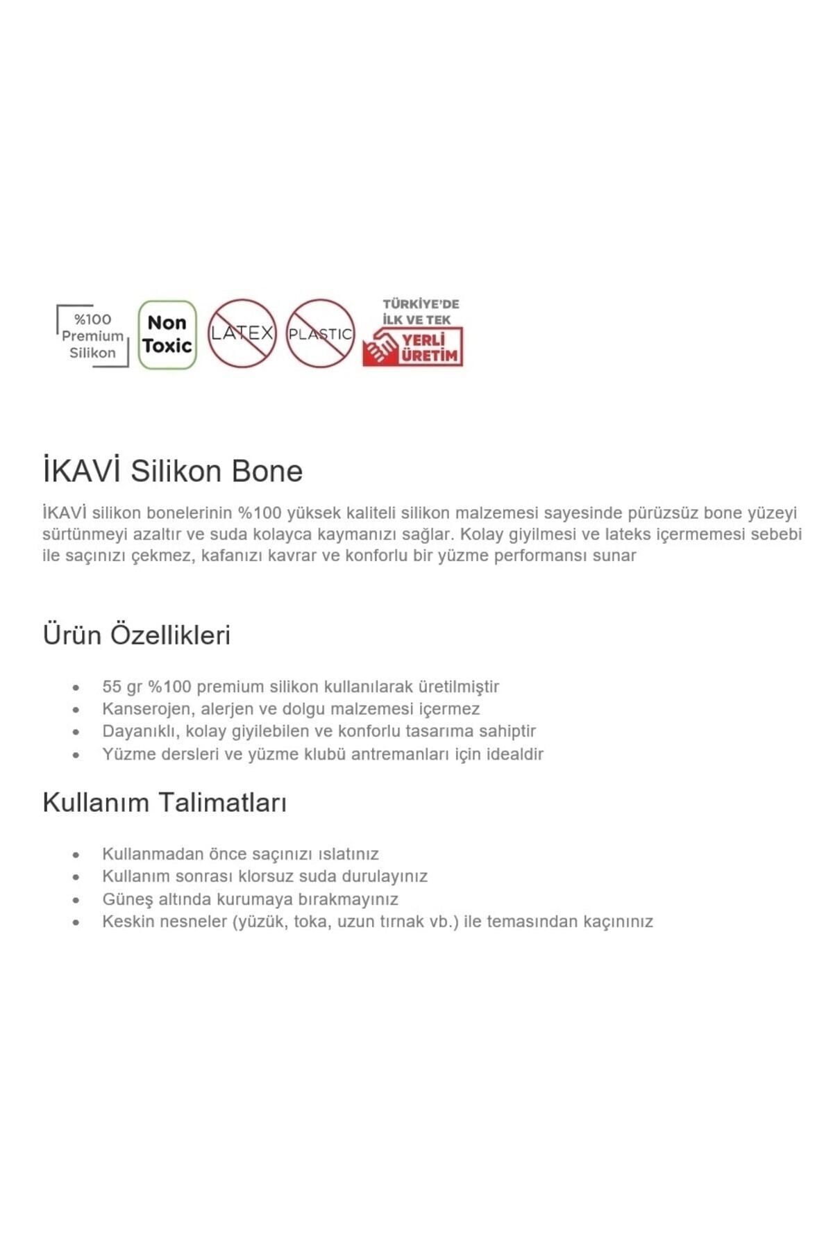 İKAVİ Silikon Bone İKAVİ silikon bonelerinin %100 yüksek kaliteli silikon malzemesi sayesinde pürüzsüz bone yüzeyi sürtünmeyi azaltır ve suda kolayca kaymanızı sağlar. Kolay giyilmesi ve lateks içermemesi sebebi ile saçınızı çekmez, kafanızı kavrar ve konforlu bir yüzme performansı sunar Ürün Özellikleri 55 gr %100 premium silikon kullanılarak üretilmiştir