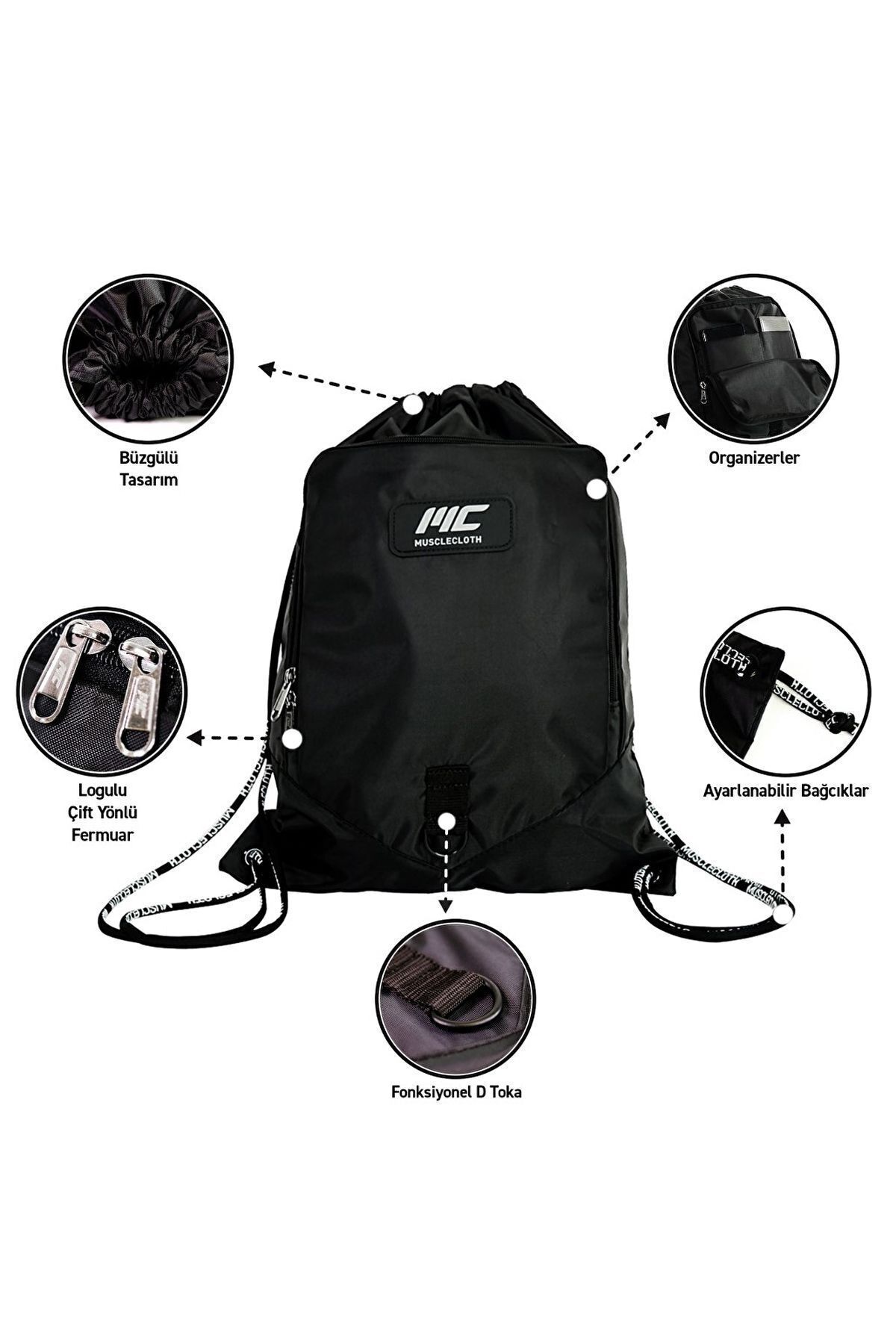 MuscleCloth Sackpack Spor Çanta Siyah Açıklama Musclecloth Sackpack Spor Çanta ister spora giderken, ister günlük hayatta ihtiyacınız olan eşyaları taşıyabileceğiniz oldukça hafif ve pratik bir üründür. Çantanın ön kısmında yer alan fermuarlı gözü sayesinde özel eşyalarınızı düzenli bir şekilde muhafaza edebilir, ayarlanabilir kordonları ile en hafif sırt çantası deneyimini yaşabilirsiniz. Ön kısımda yer alan metal halka aksesuarı ile çantanıza farklı bağlantılar da ekleyebilirsiniz. MuscleCloth Sackpack Spor Çanta Siyah Özellikleri: Ayarlanabilir kordon tasarımı