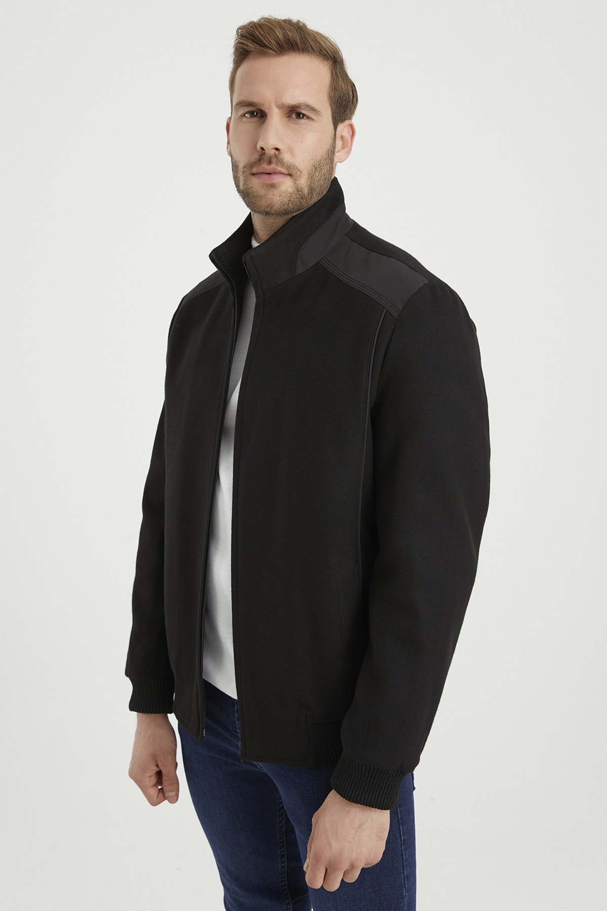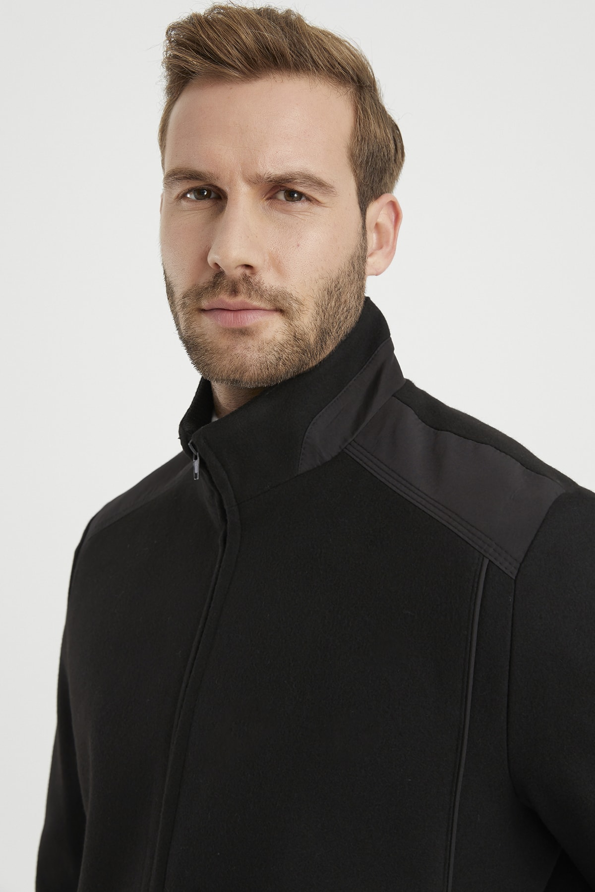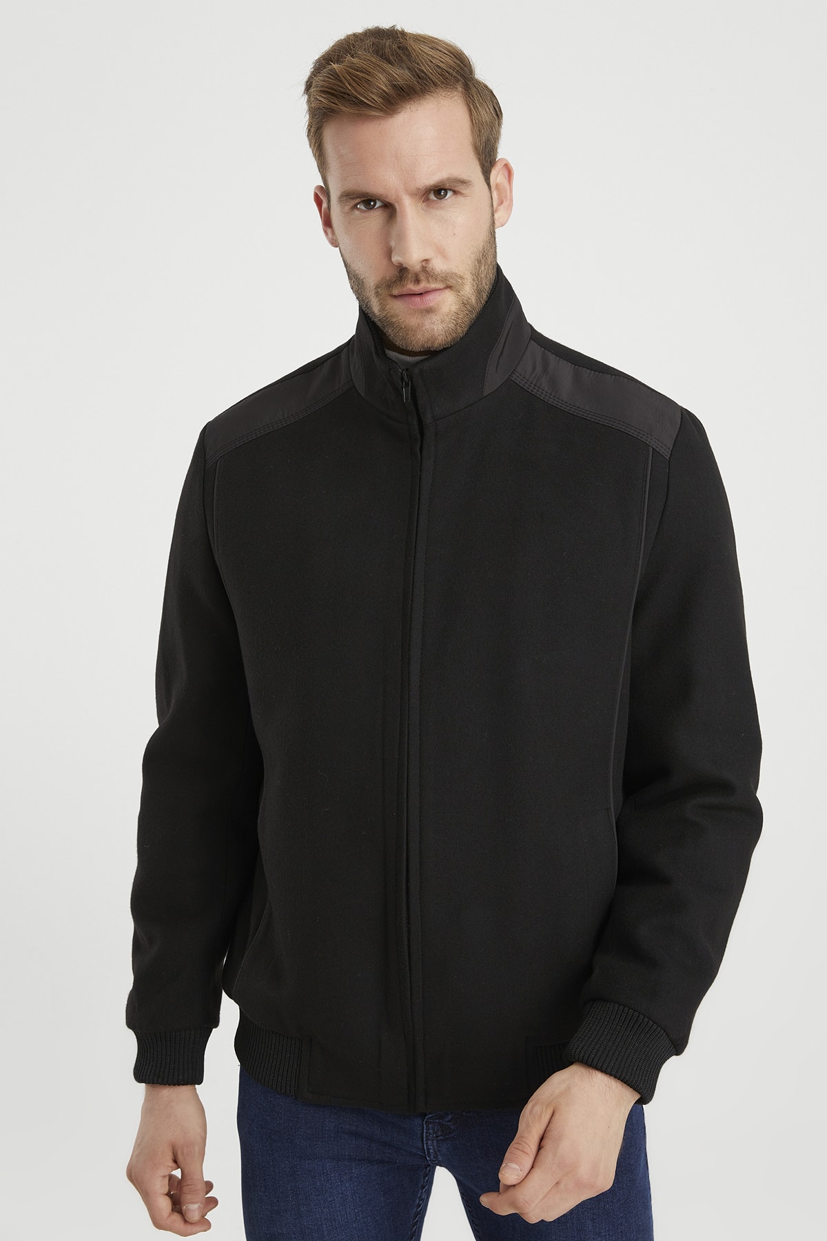 Erkek Siyah Yün Karışımlı Rahat Kalıp Kaşe Mont