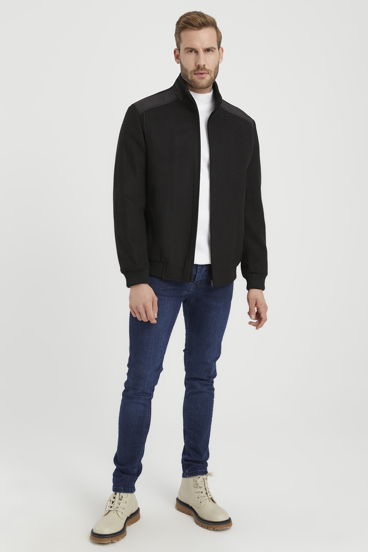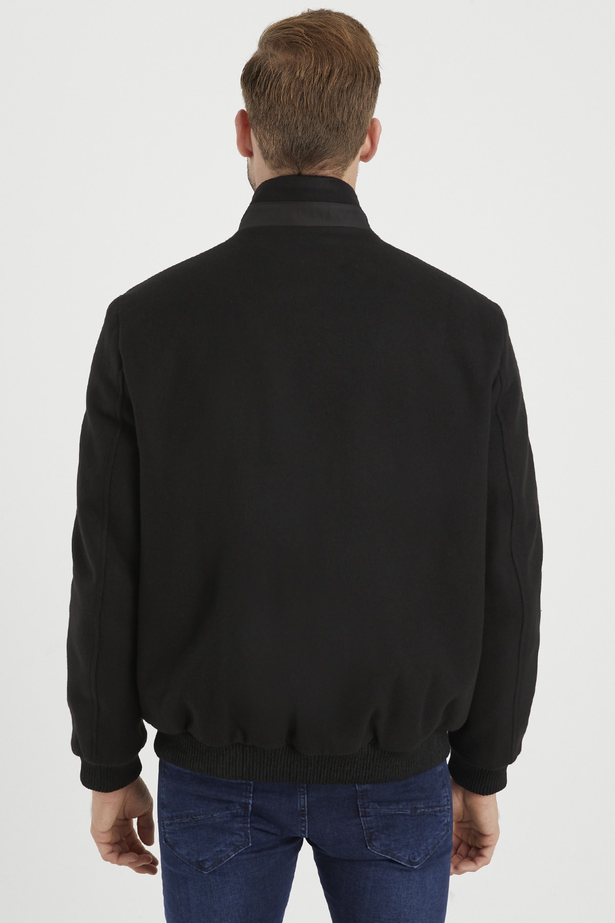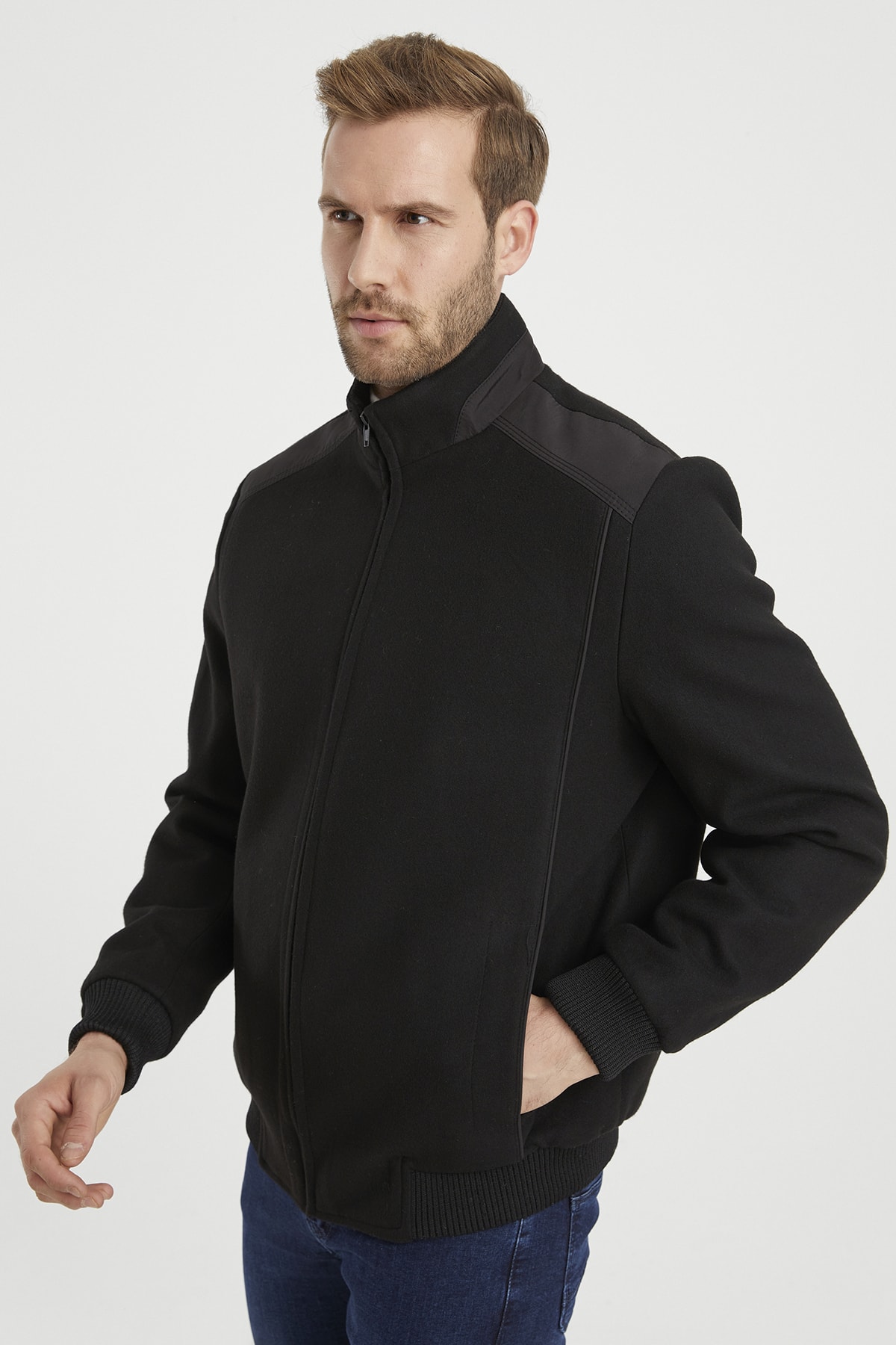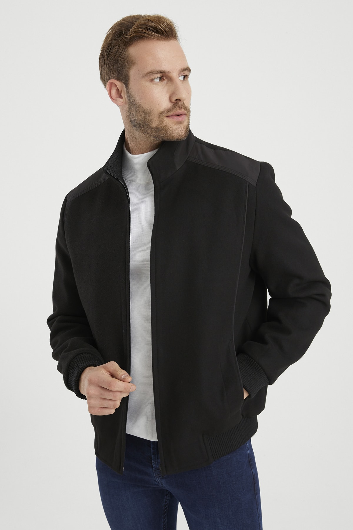 Erkek Siyah Yün Karışımlı Rahat Kalıp Kaşe Mont
