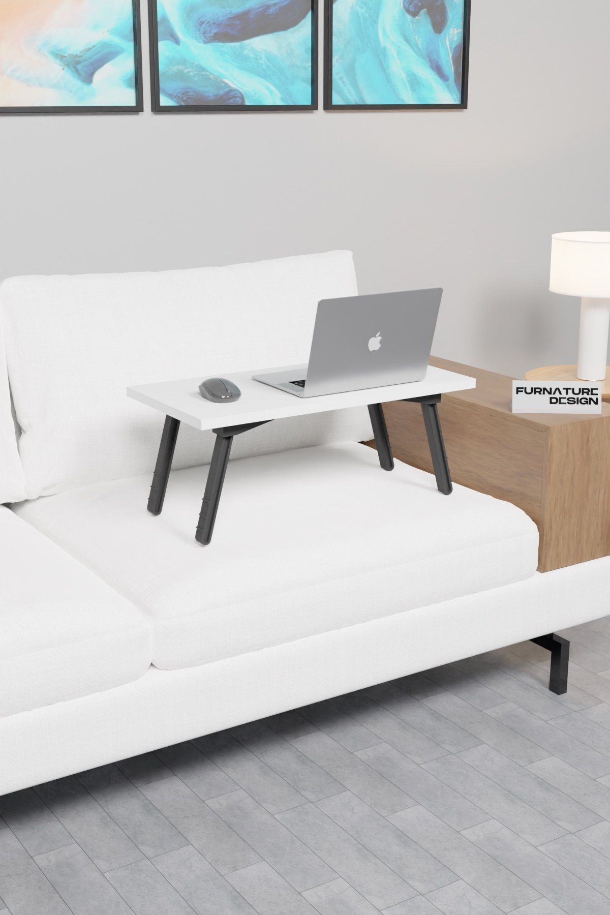 Katlanır Laptop Masası Çalışma Yatak Kahvaltı Masası 60x30 cm Beyaz Üst sınıf yonga levha ve PVC kenar bandı kullanılmıştır.