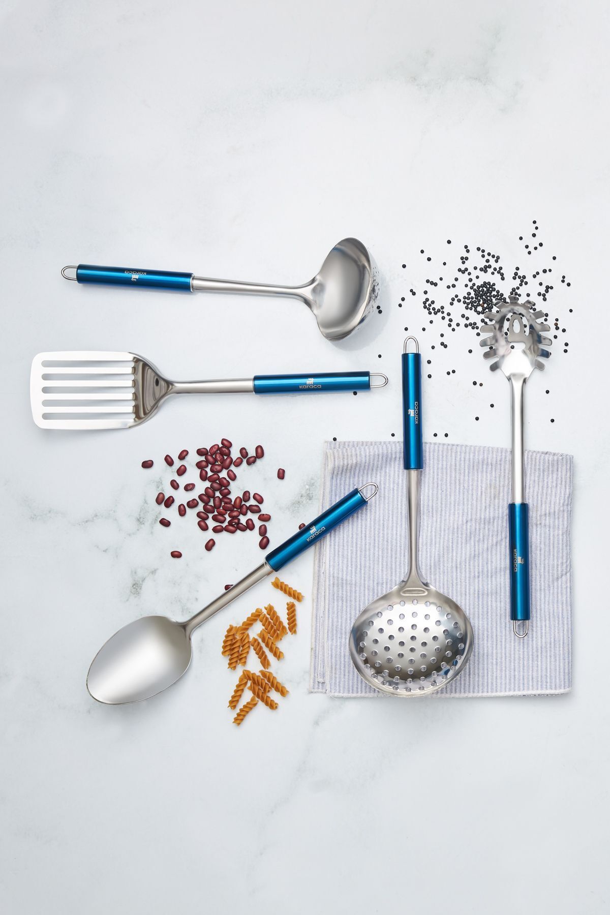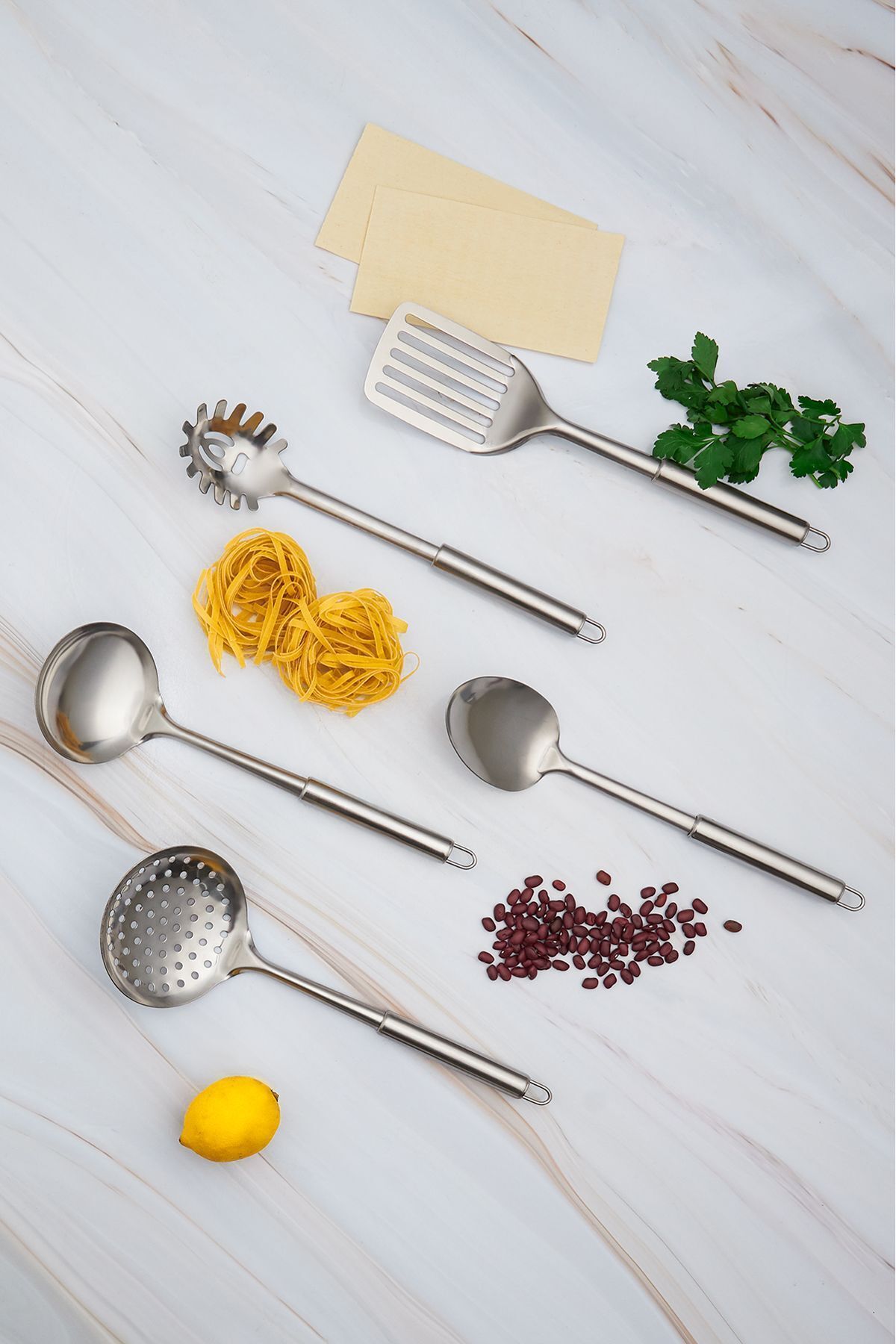 Yemek servis seti içeriğinde delikli spatula, kepçe, servis kaşığı, kevgir ve makarna kaşığı yer alır.