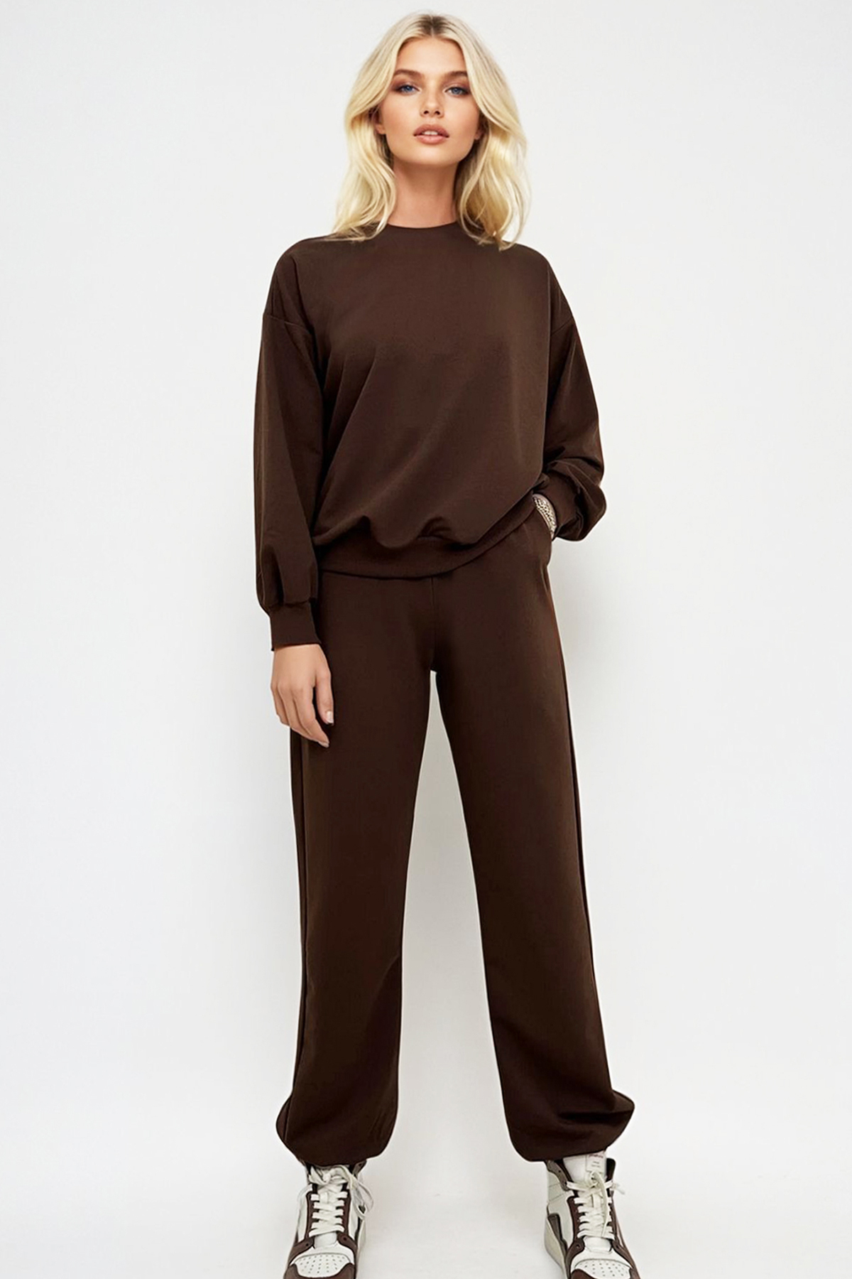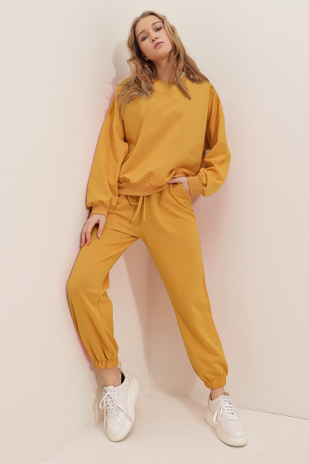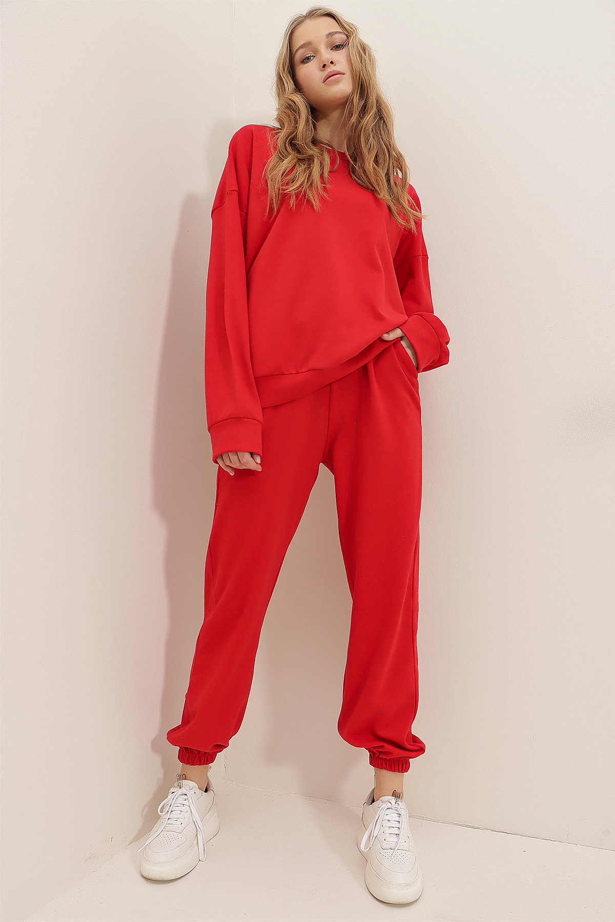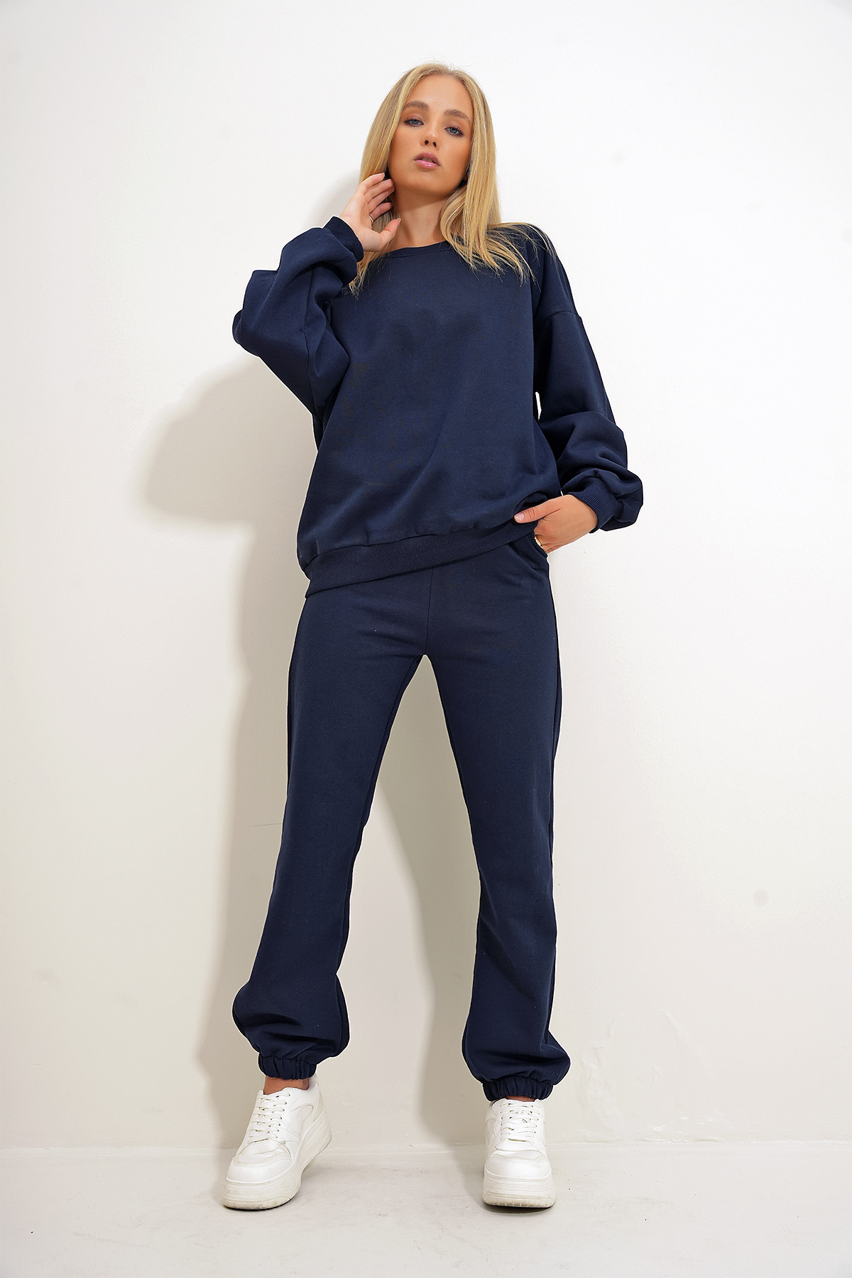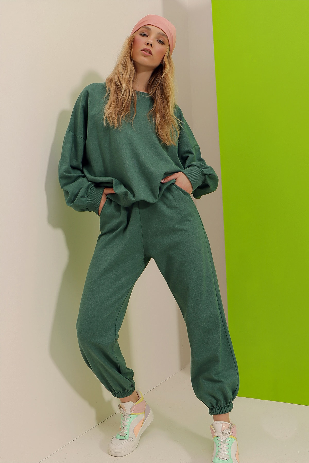 Rahat ve şık bir görünüm için sweatshirt ve pantolon olmak üzere iki parçadan oluşan eşofman takımı