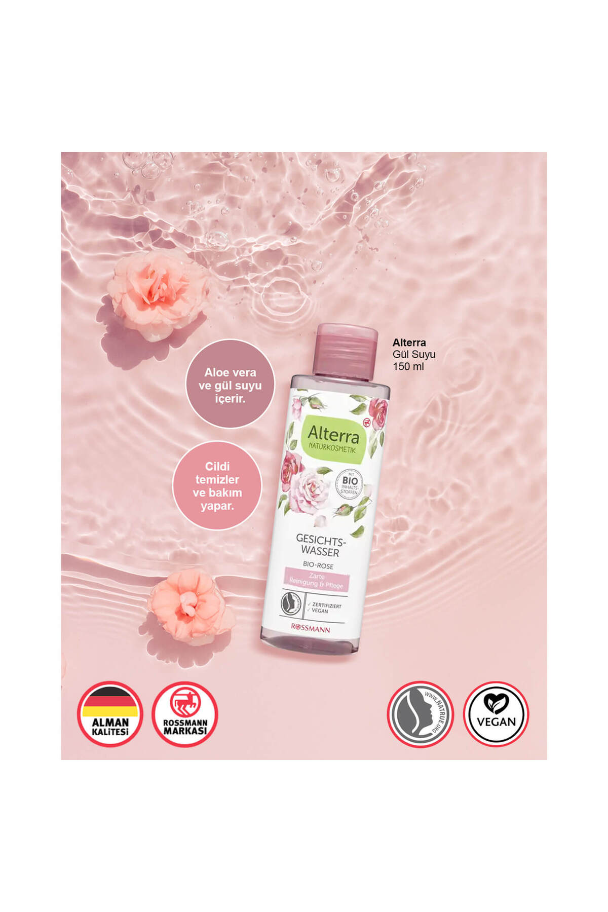 • Aloe vera ve gül suyu içeren Alterra gül suyu cildinizi temizler ve cildinize bakım yapar.