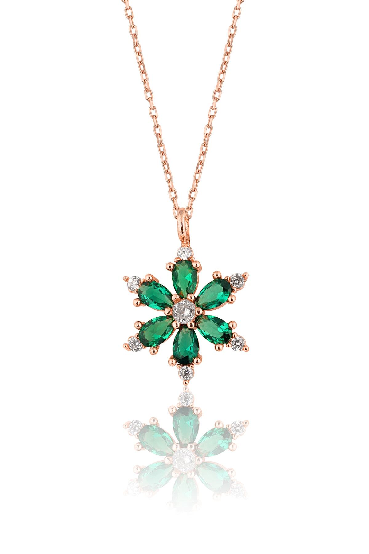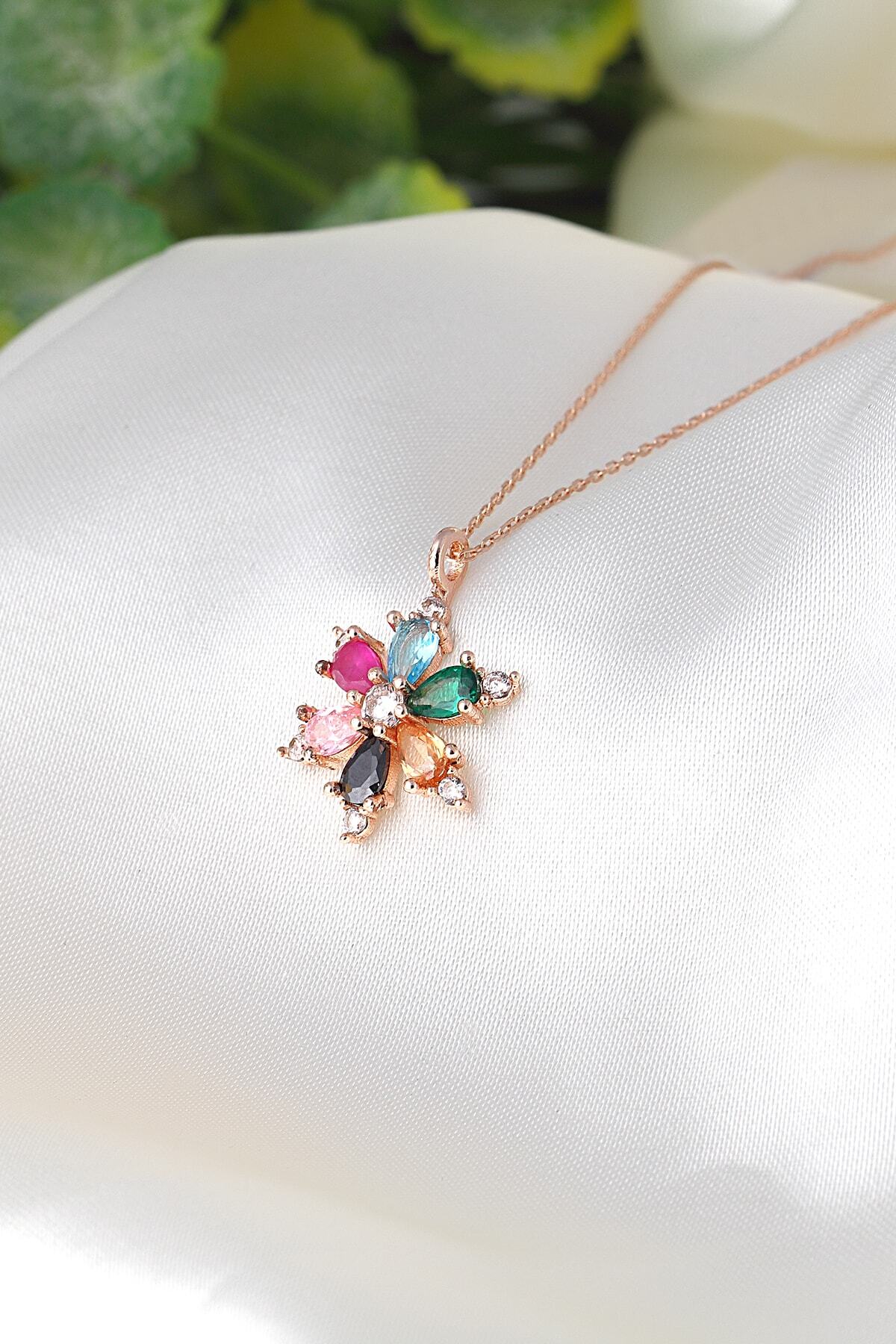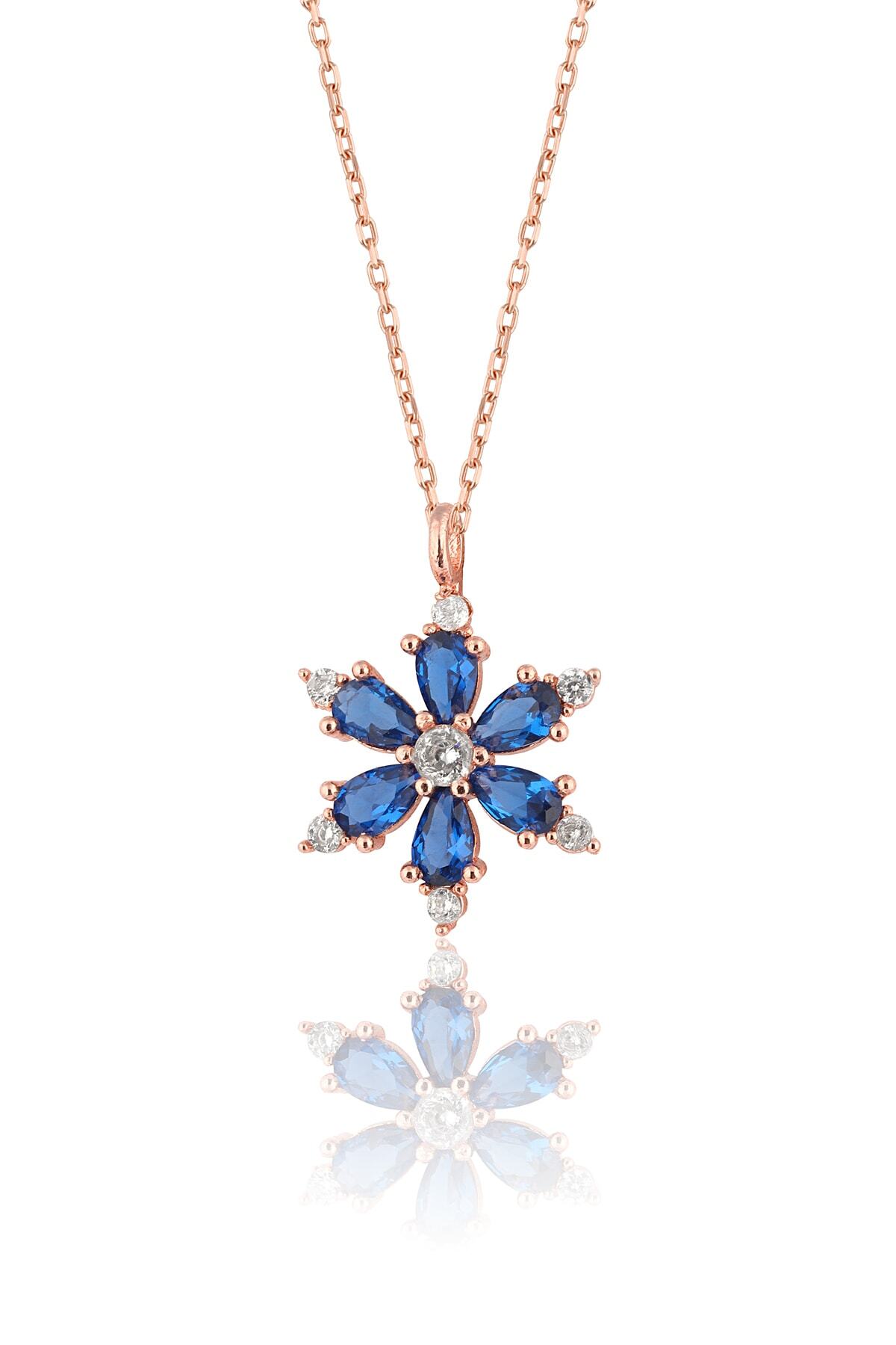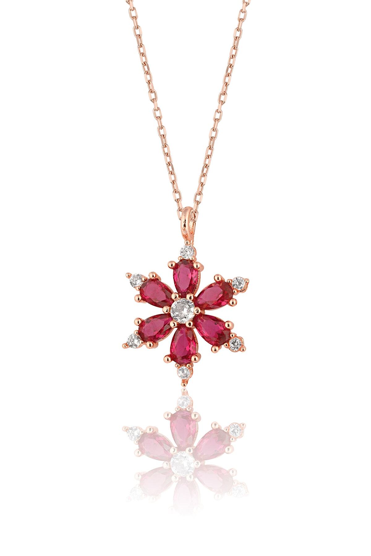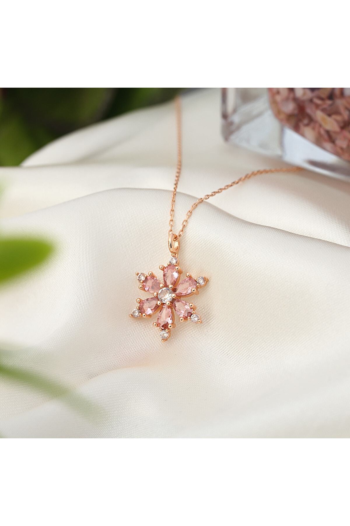 925 ayar gümüş zincirli, rose kaplamalı, Ametist taşlı Lotus Kamelya Çiçeği kolye.