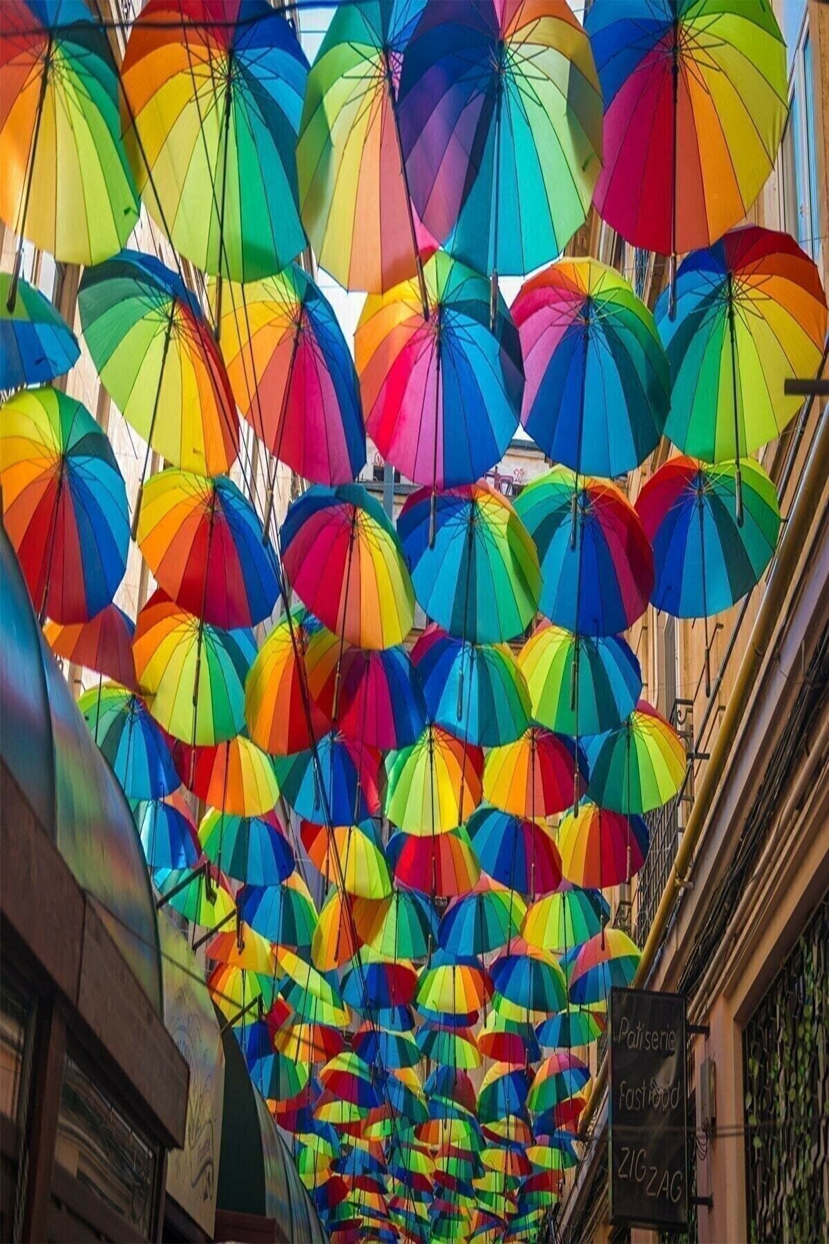 Göz alıcı gökkuşağı desenleriyle süslenmiş, büyük boy şemsiye, yağmurlu günlerde stilinizi korumanızı sağlar