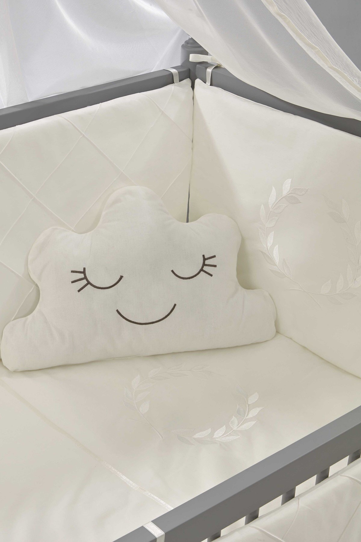 9 parçadan oluşmaktadır: 1 adet yorgan, 1 adet çarşaf (tüllü), 1 adet bulut yastık, 2 adet fermuarlı kısa kenar koruma, 2 adet fermuarlı uzun kenar koruma, 1 adet cibinlik, 1 adet cibinlik aparatı
