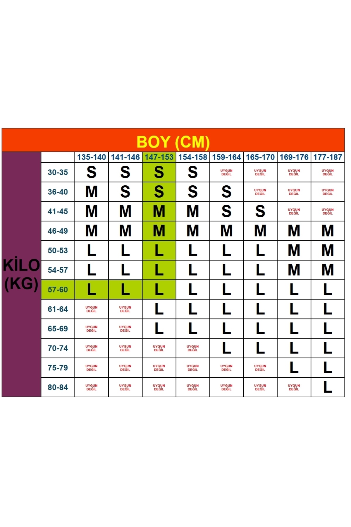 S beden 35-45 kg kadar, M beden 46-56 kg kadar, L beden 57-85 kg kadar.