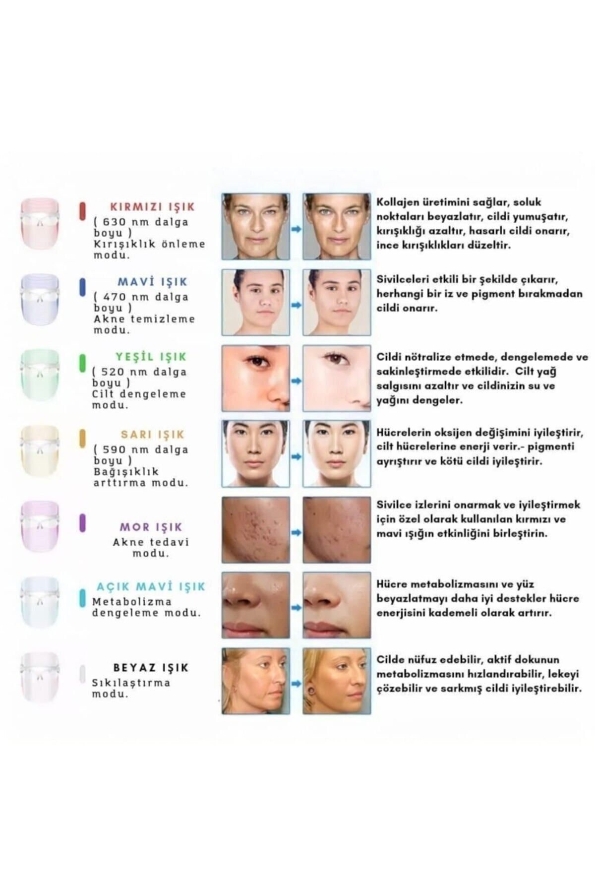 Ürünün 7 renk işlevi: 1. Kırmızı ışığın dalga boyu 620 ila 750nm arasında değişir ve kan dolaşımını azaltır, metabolizmayı hızlandırır, kırışıklık bakımına ve cilt iyileştirmesine yardımcı olan cllagen üretir.