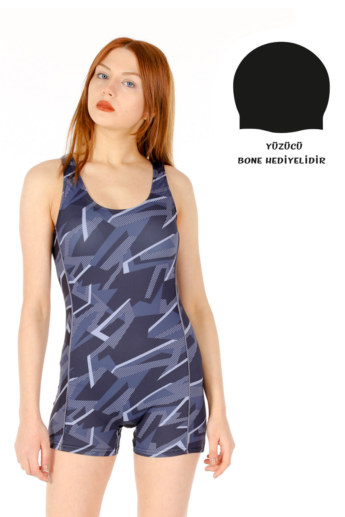 Kadın Desenli Şortlu Yüzücü Mayo Lacivert (GÖĞÜS PEDLİ)