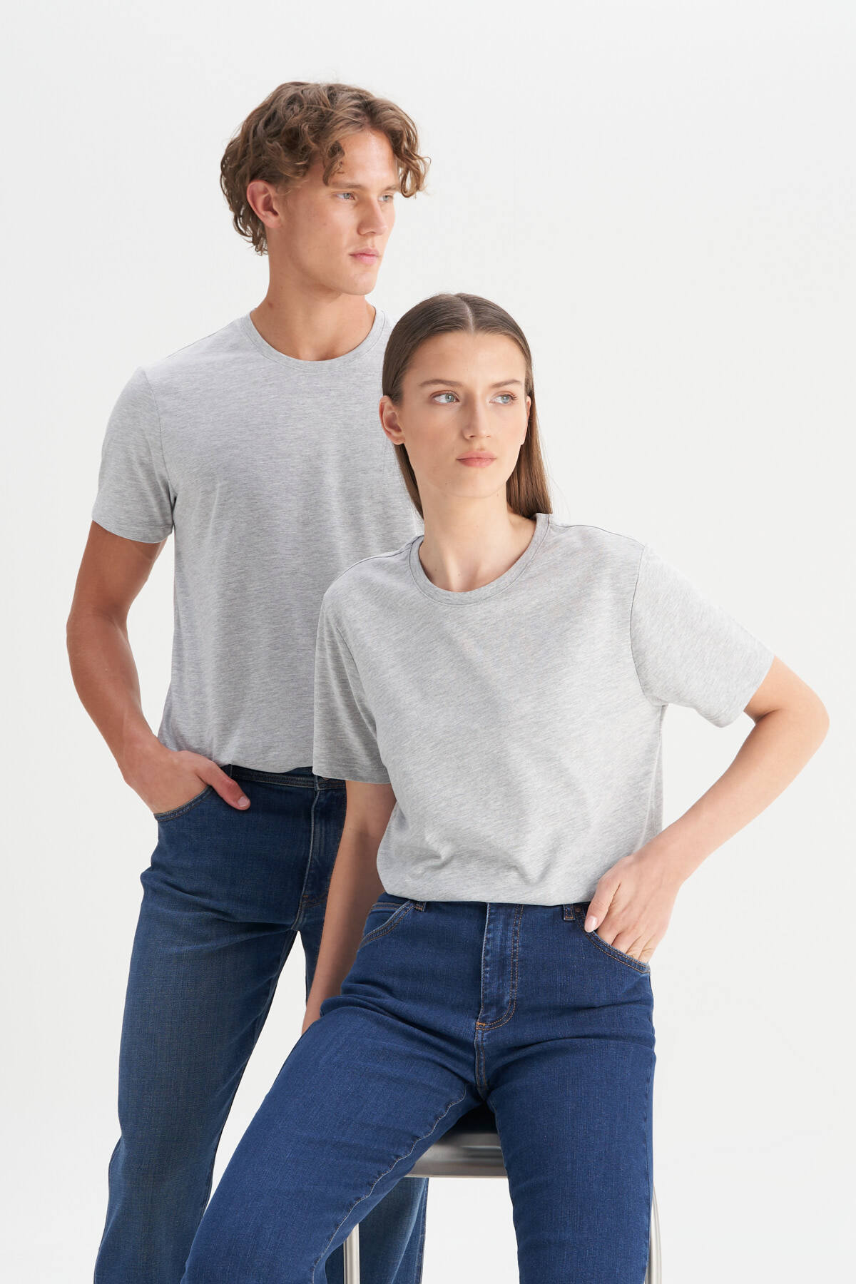 %50 Pamuk, %50 Polyester, Düz Gri Melanj, Bisiklet Yaka, Slim Fit, Kısa Kol, Cepsiz, 4 Mevsim, AC&CO / Altınyıldız Classics Slim Fit Bisiklet Yaka Kısa Kollu Pamuklu Tişört, Manken Ölçüleri: Boy:1