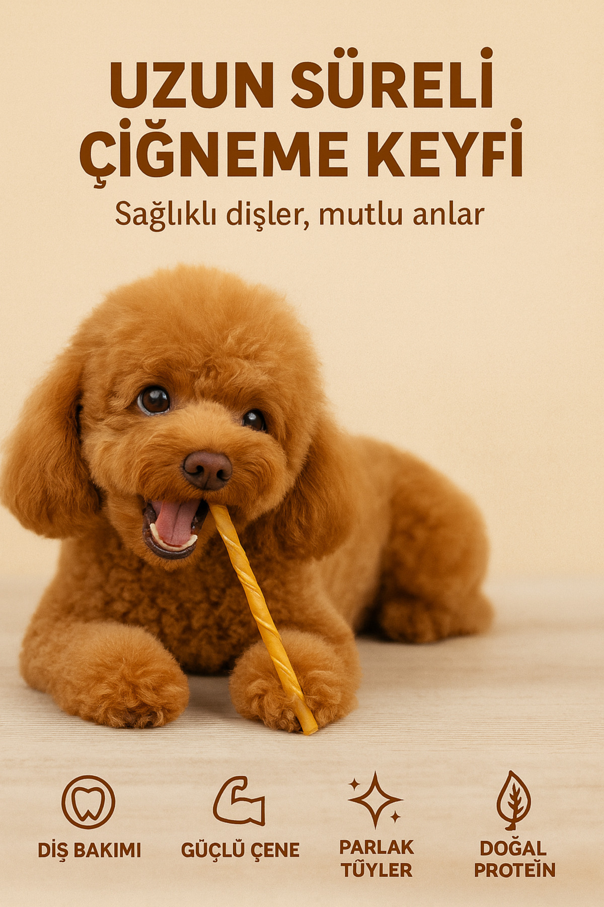 Uzun süreli çiğneme keyfi sunan burgu yapısı sayesinde, köpeğinizin diş sağlığını destekler, ağız kokusunun azalmasına yardımcı olur ve stres seviyesini düşürür.