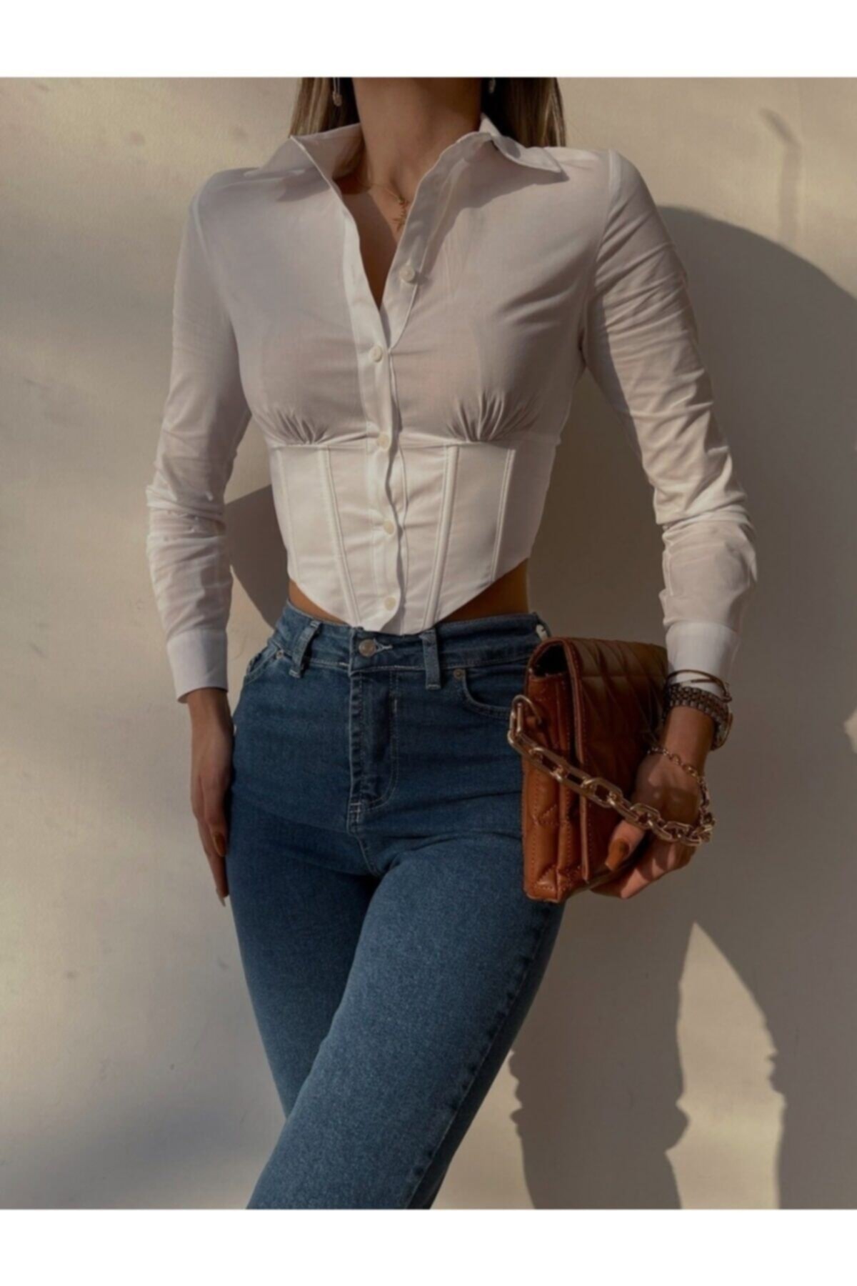 Klasik ve zamansız tasarımıyla her gardıropta yerini alacak beyaz korseli gömlek, düz kesimi ve regular boyu ile rahat bir kullanım sunar