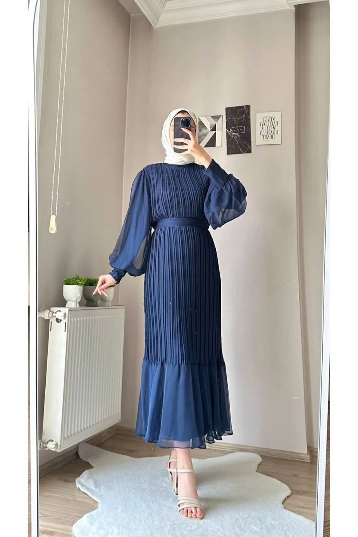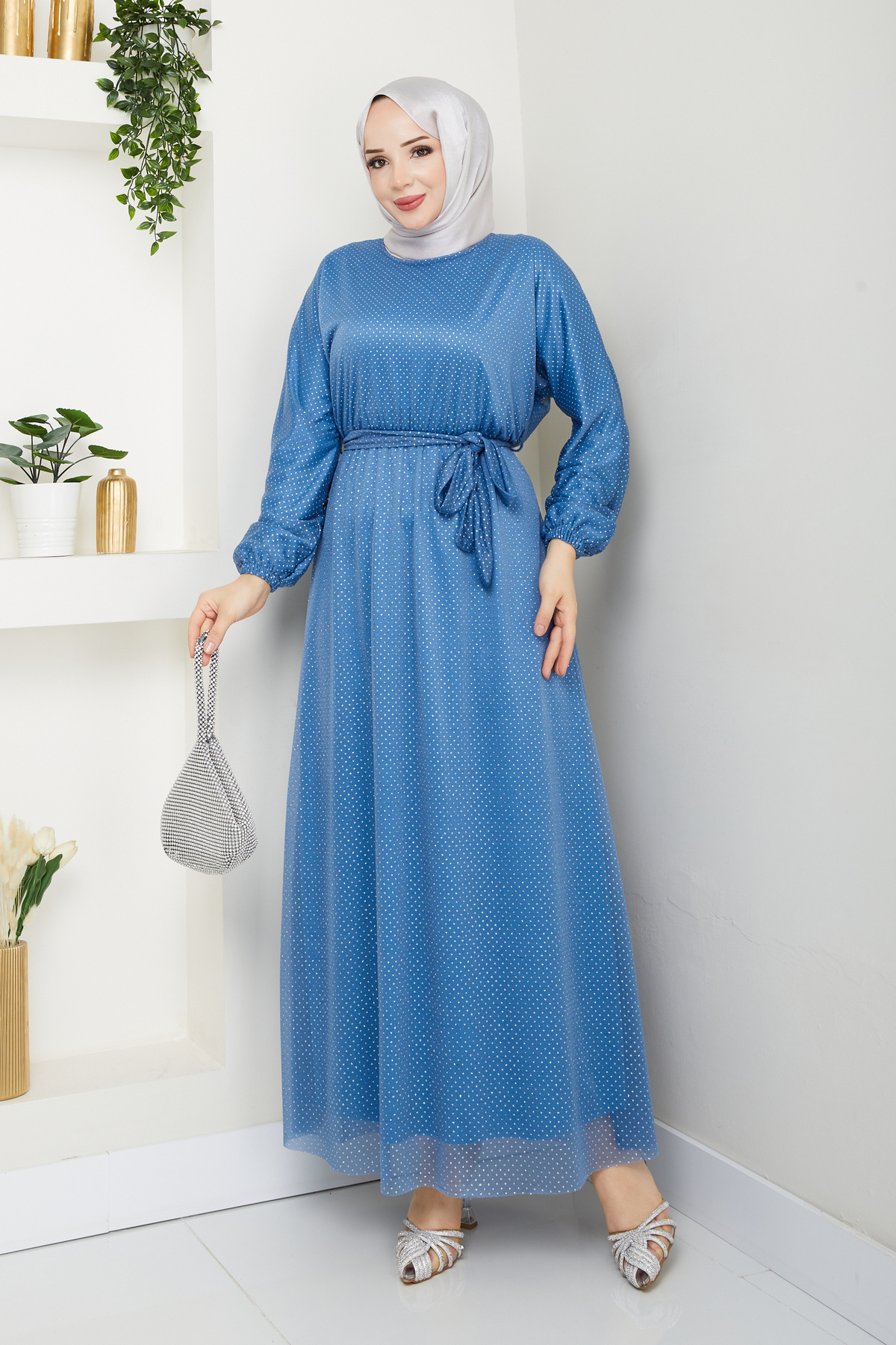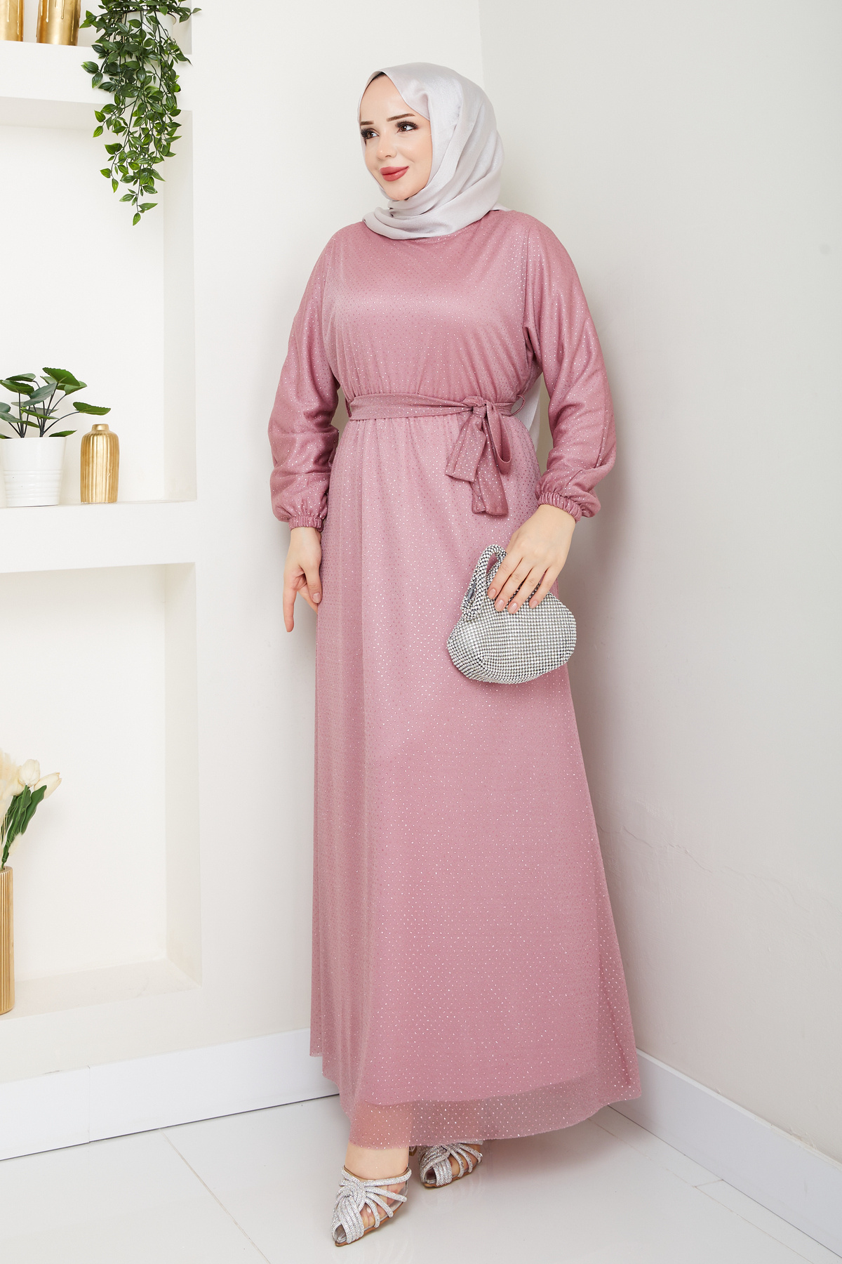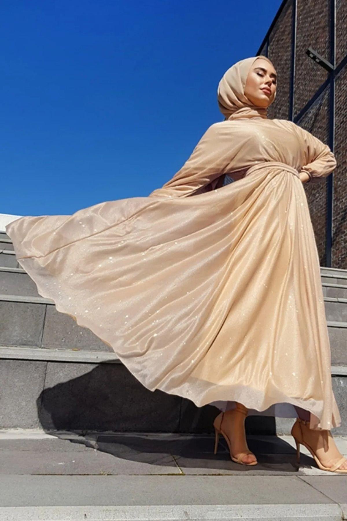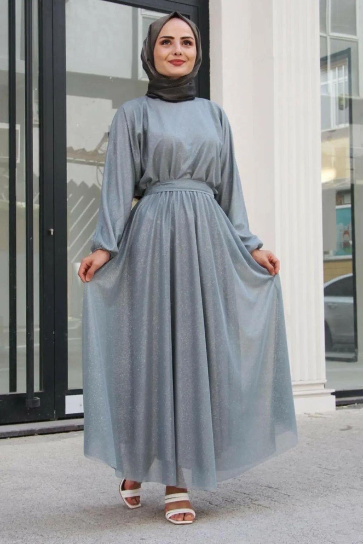 - Zarif tasarımıyla dikkat çeken simli belden kuşaklı siyah tesettür abiye elbise, şıklığınızı geceye taşır.
