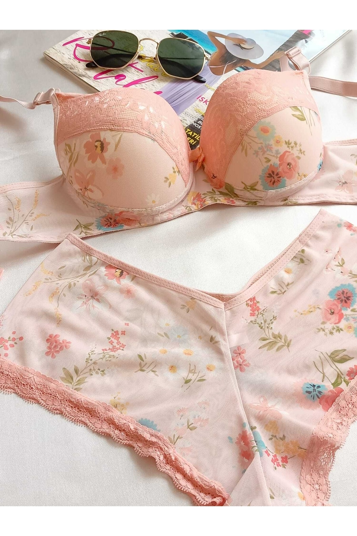 Evde rahatlıkla kullanabileceğiniz çiçek desenli iç çamaşırı takımı, şıklığı ve konforu bir arada sunar