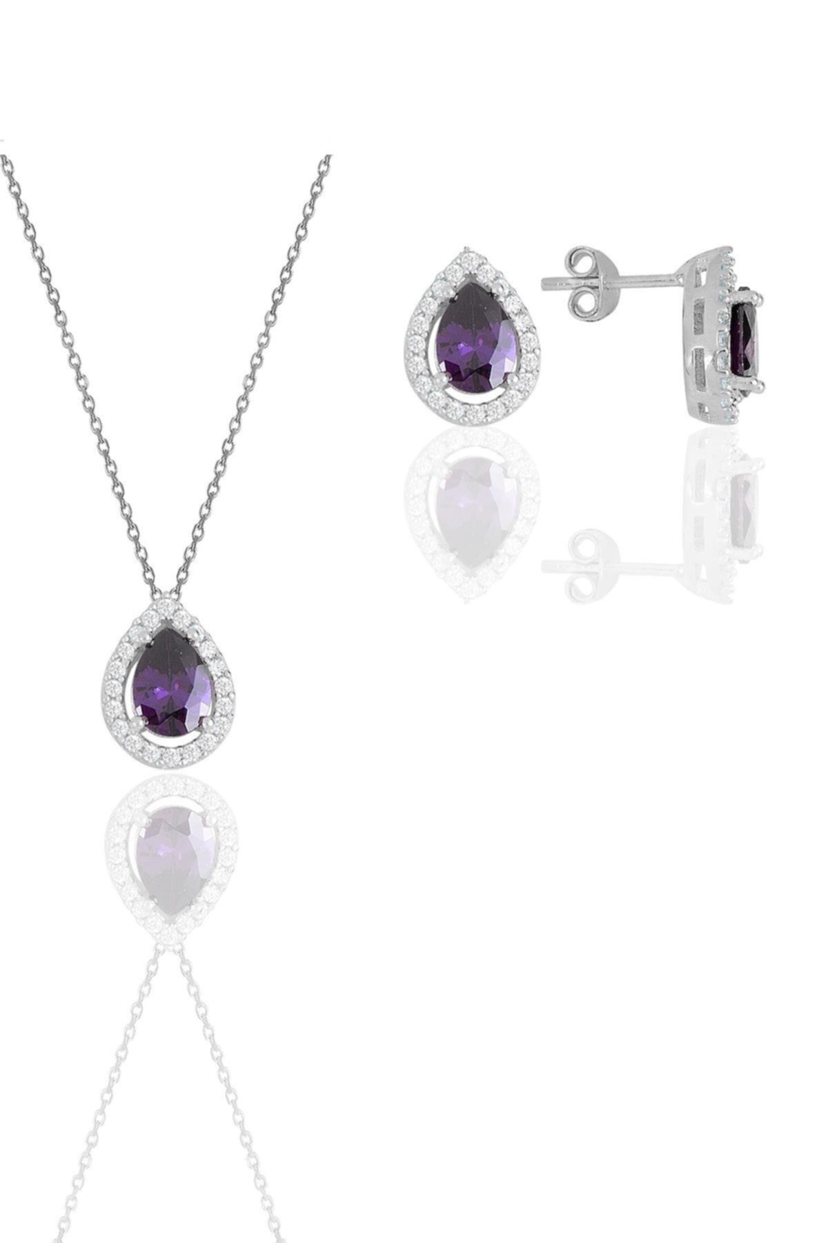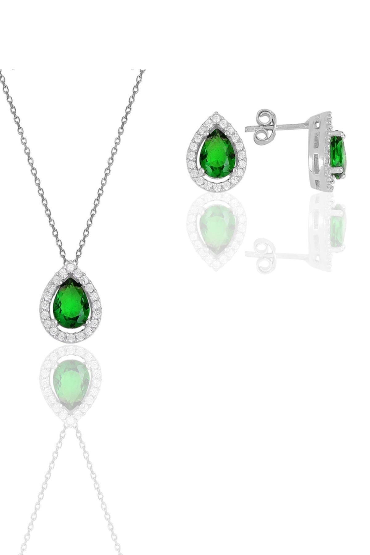 925 ayar gümüş rodyumlu kök zümrüt taşlı pırlanta modeli damla ikili set.