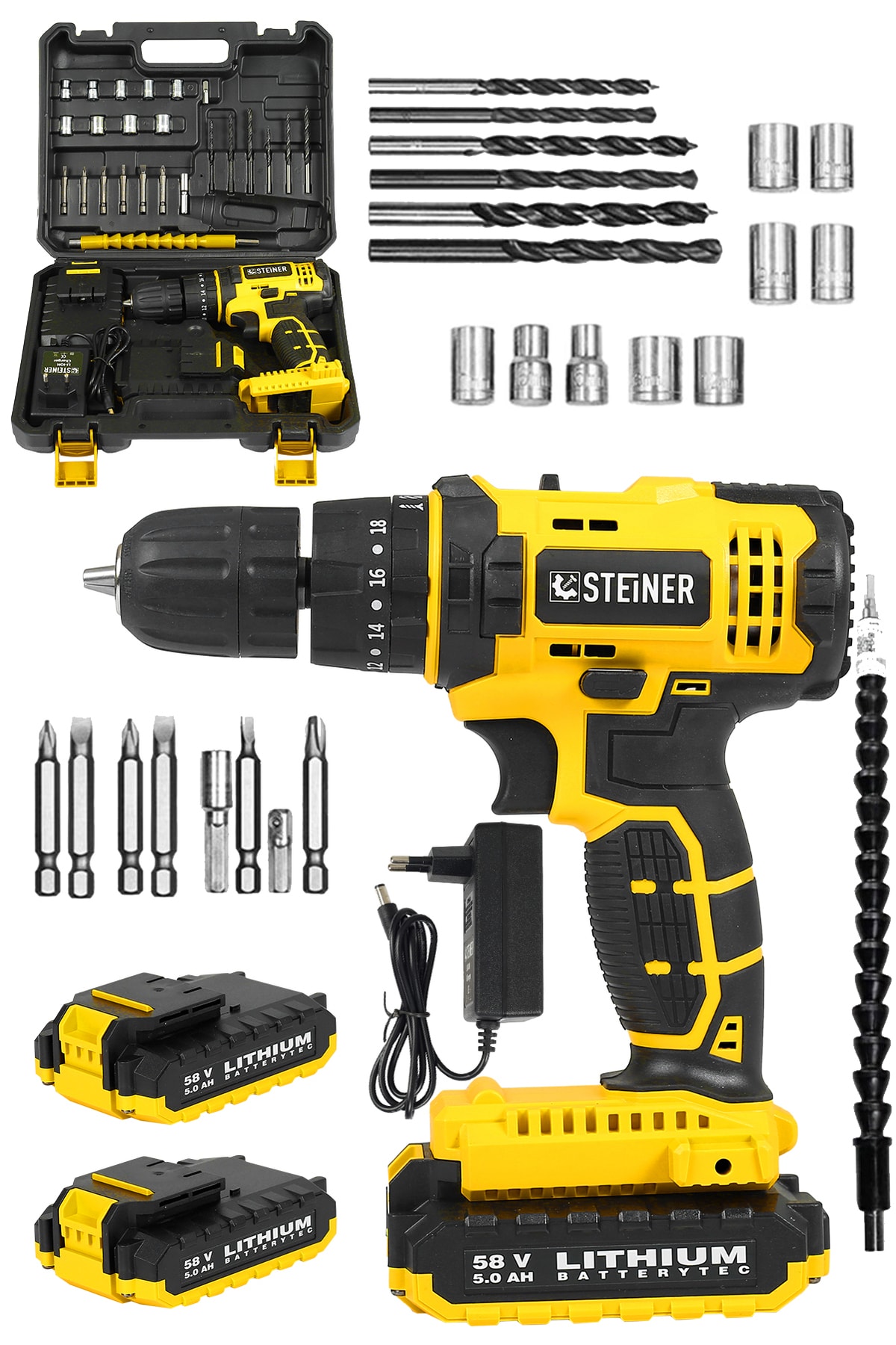 Alman Steiner 58 v 5 ah darbeli metal şanzuman çift akülü şarjlı matkap + 27 parça setli Otomatik kitleme özelliği ile ev ve işte sorunsuz tuğla duvar delme Hızlı kolay vidalama Otomatik mil kilidi işlevi Dahili yüksek hassasiyetli rulman ile metal vites kutusu Ileri