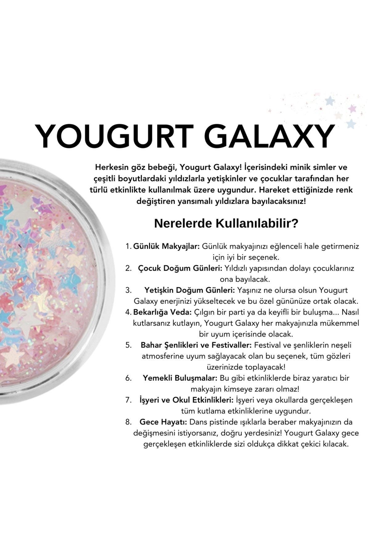 Nasil kullanilir?Jel bazli glitterlari isteginize gore makyaj fircanizla ya da parmaginizla uygulayabilirsiniz.