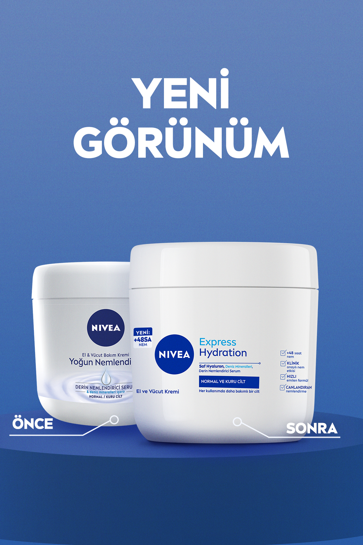 • Her kullanımda daha bakımlı bir cilt için NIVEA Express Hydration El ve Vücut Bakım Kremi 400 ml!