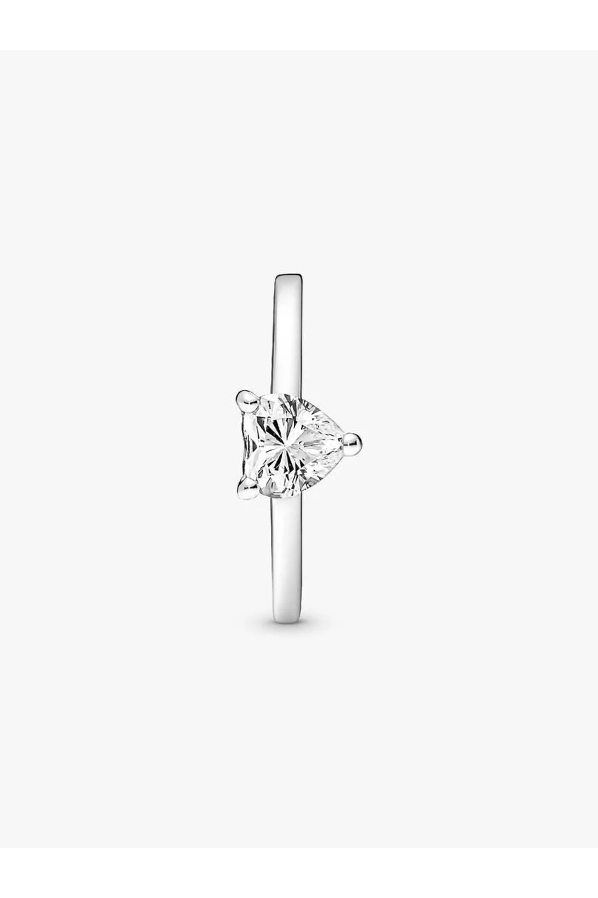 Tektaş koleksiyonumuza eklenen ışıltılı parça. Bu 925 ayar gümüş yüzük, tırnak montürlü büyük kalp şekilli kübik zirkona ve parlak gövdenin iç kısmında Pandora logosuna sahip.
